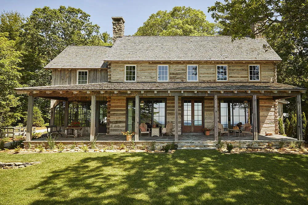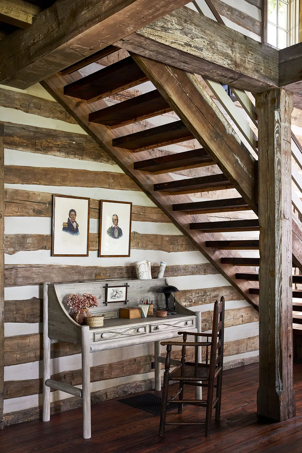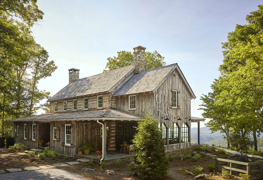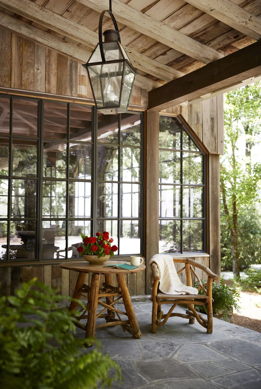 再生材を使用して作られた木造のコテージに、ヴィンテージ調の家具が備え付けられている