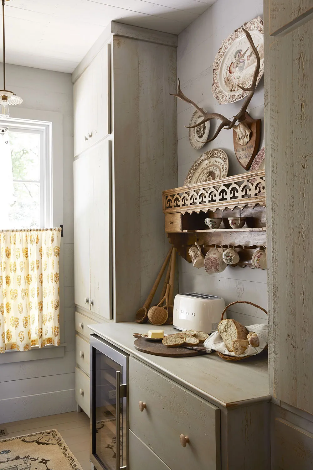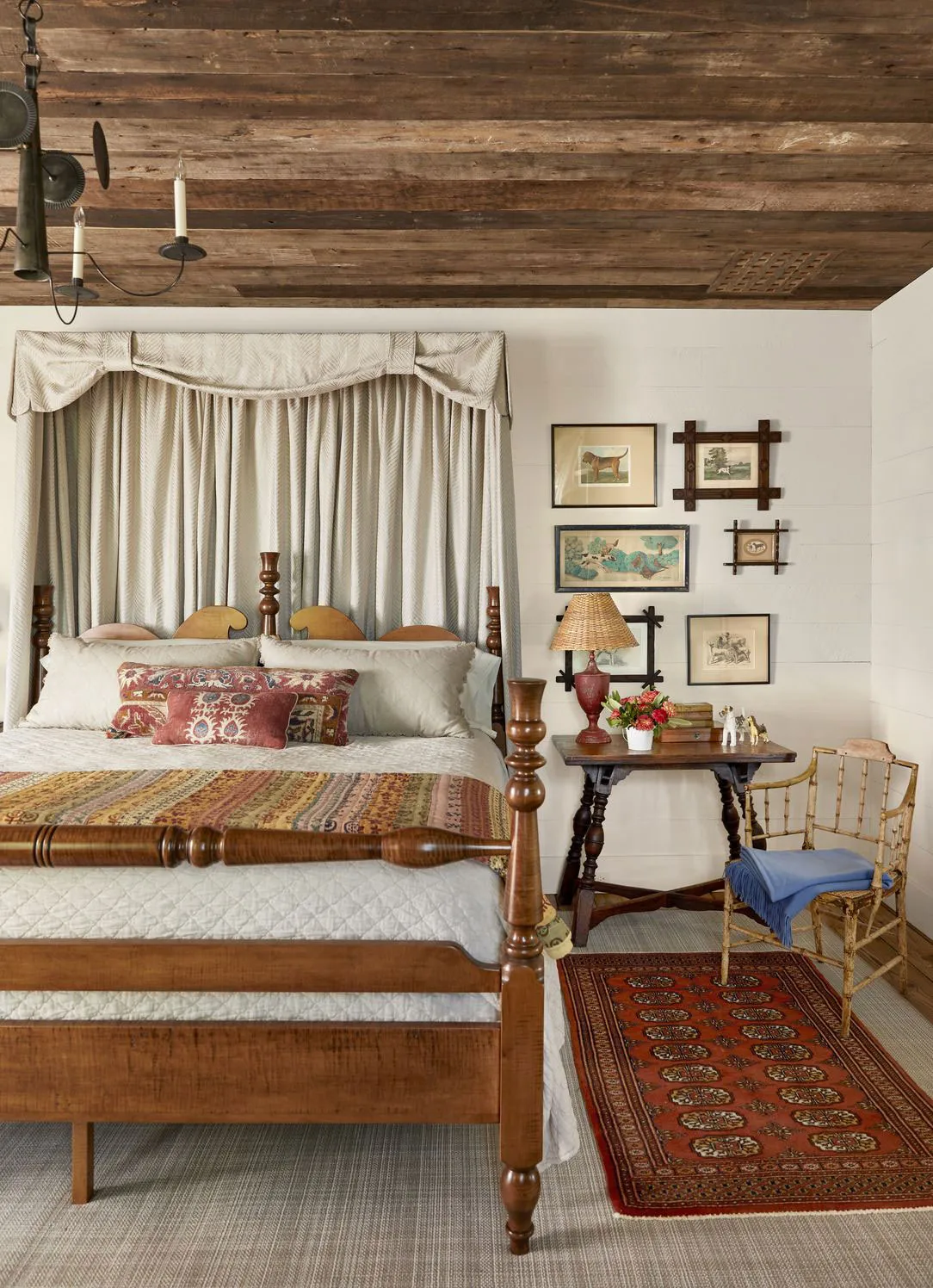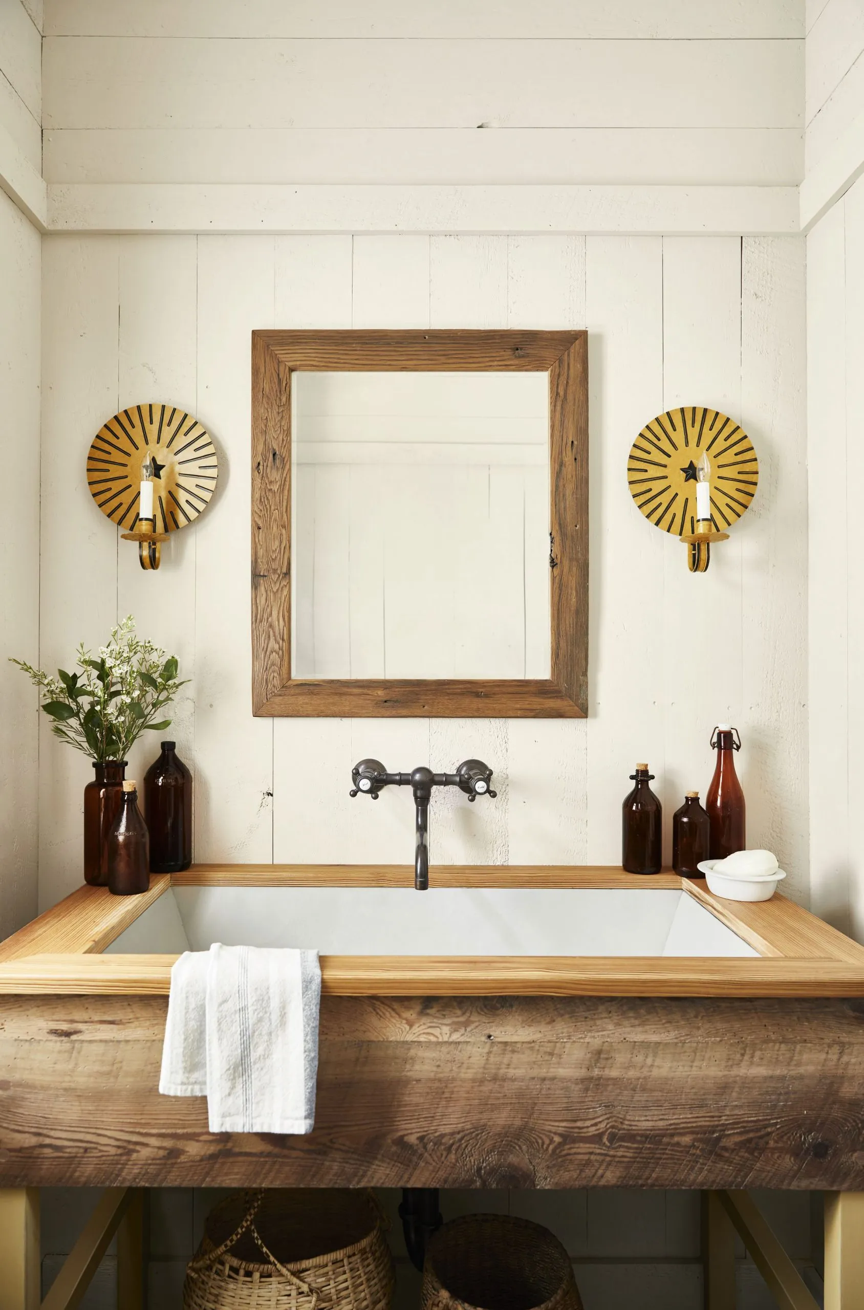 再生材を使用して作られた木造のコテージに、ヴィンテージ調の家具が備え付けられている