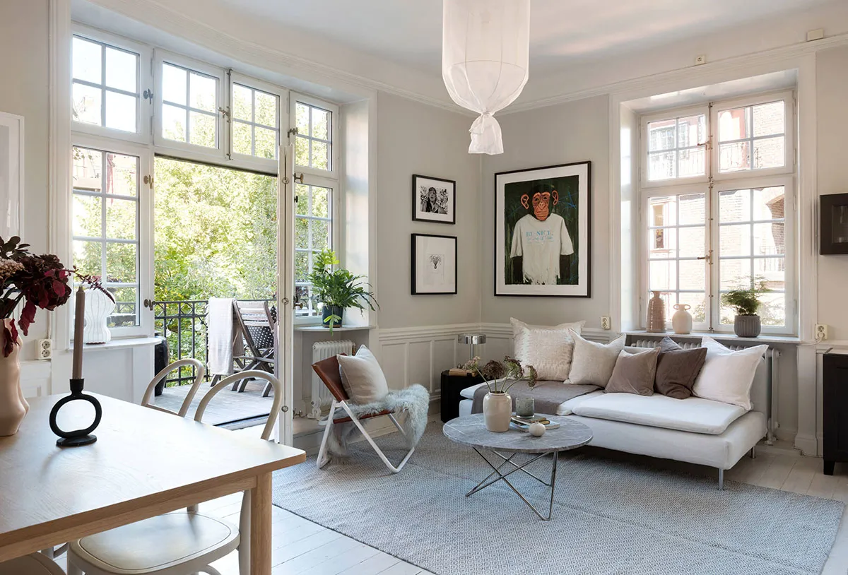 洗練されたスカンジナビア風のインテリアに、大胆な壁掛けアートが映える