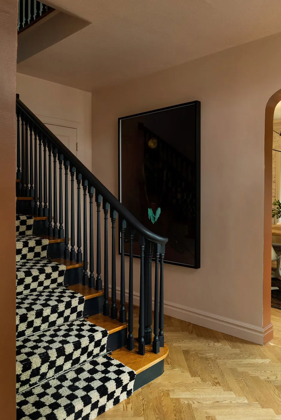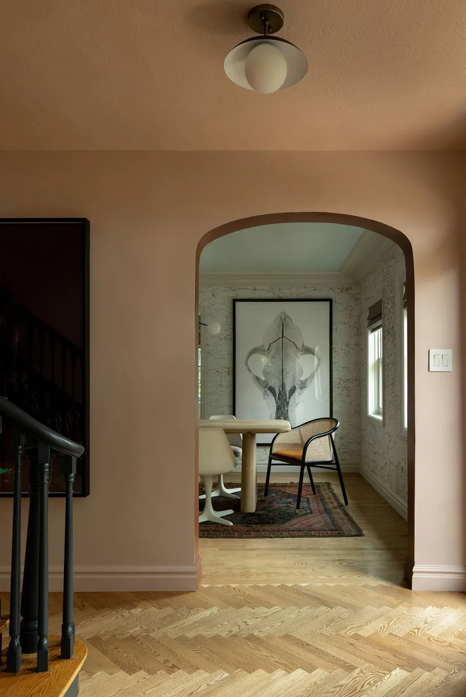 赤みがかった色調と緑のダイニングテーブルを持つスカンジナビア風のアパートメント