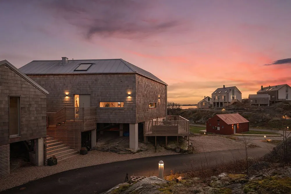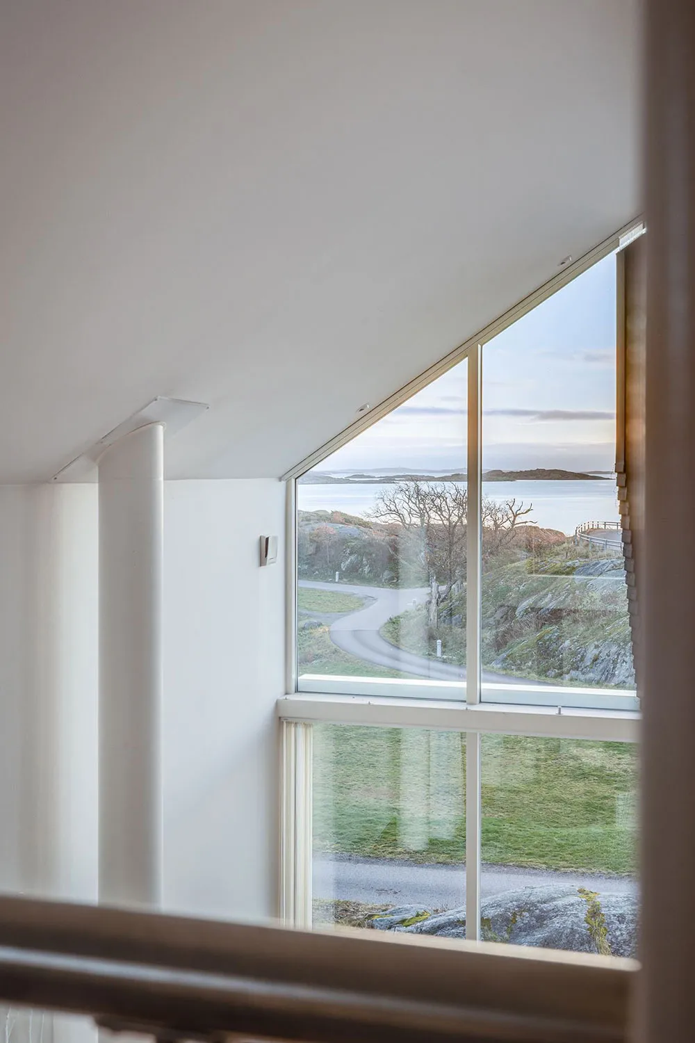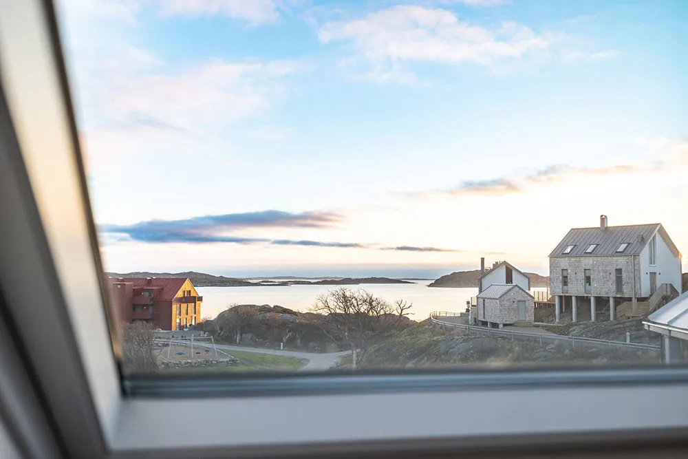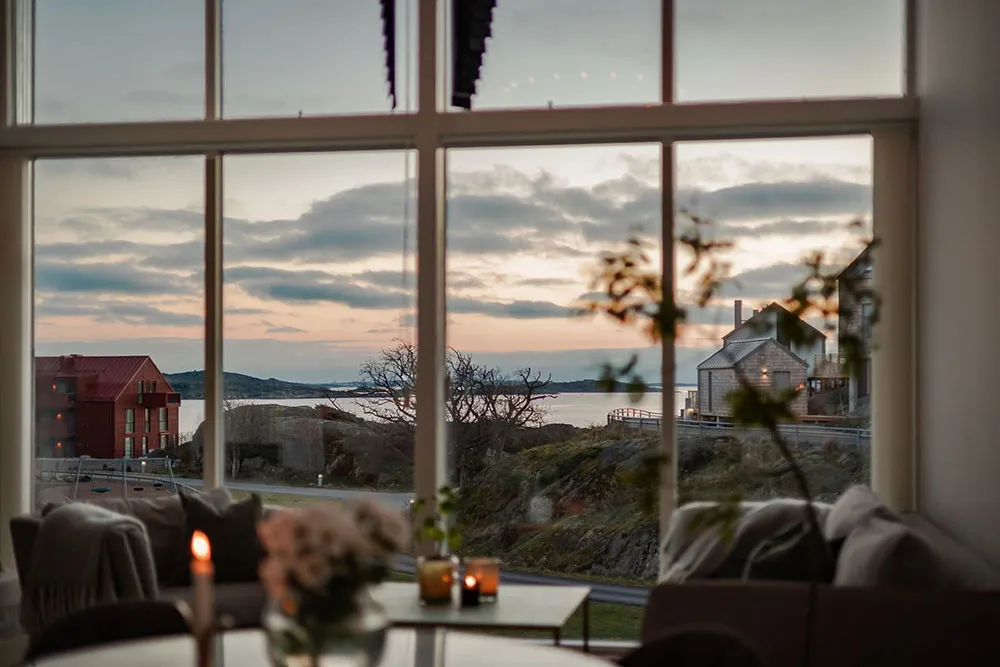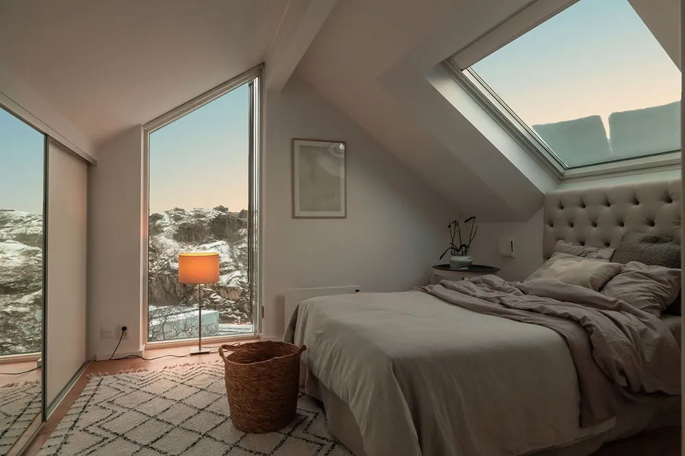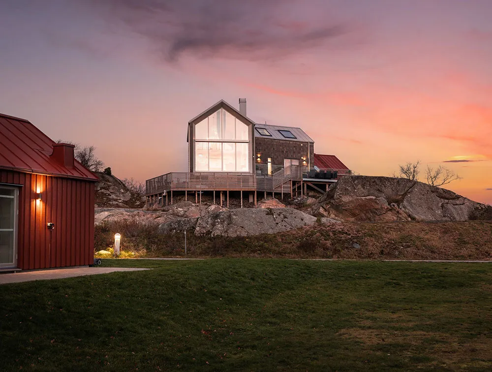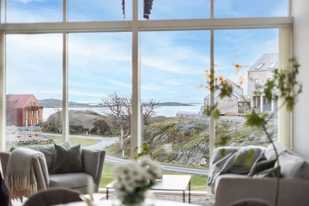 スウェーデンにあるこのモダンなコテージの窓からは、バルト海沿岸の険しい石だらけの風景がその美しさを存分に映し出しています。