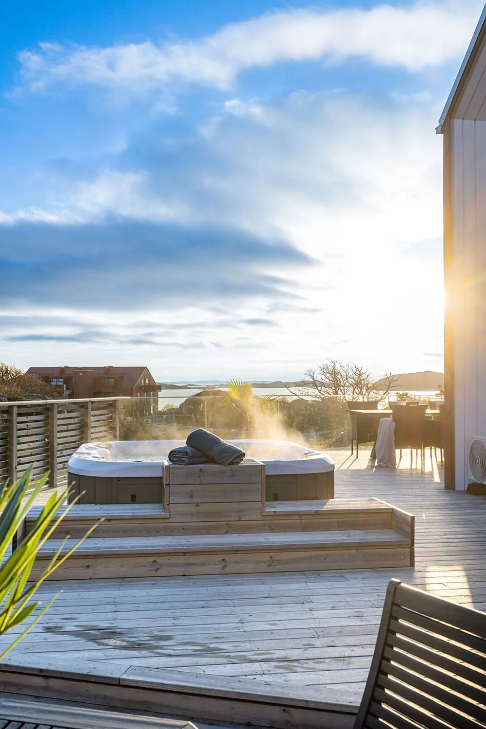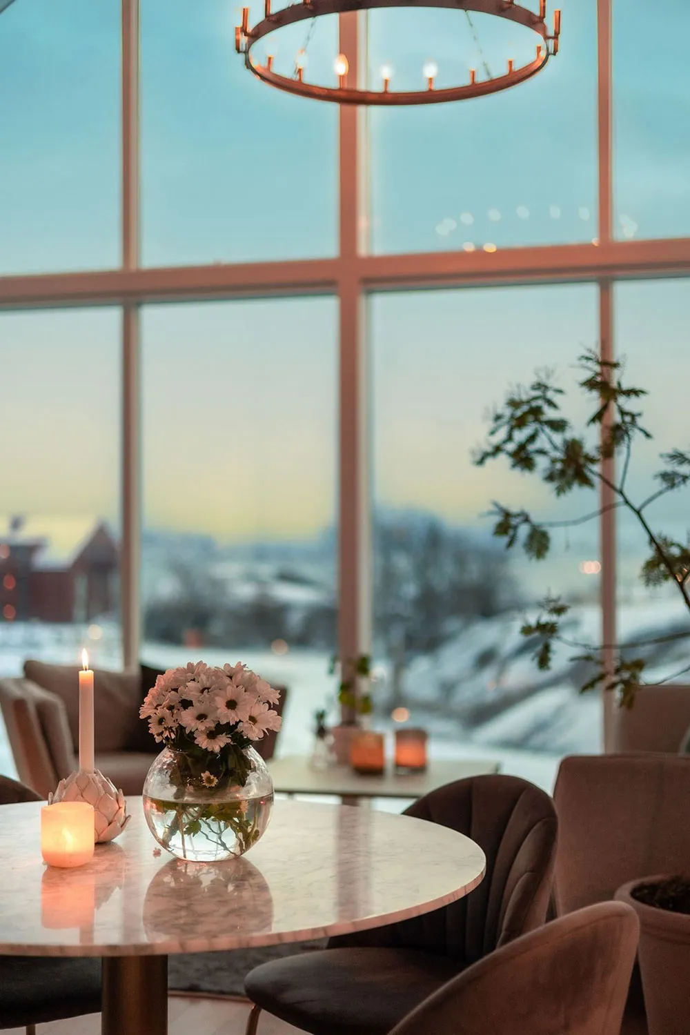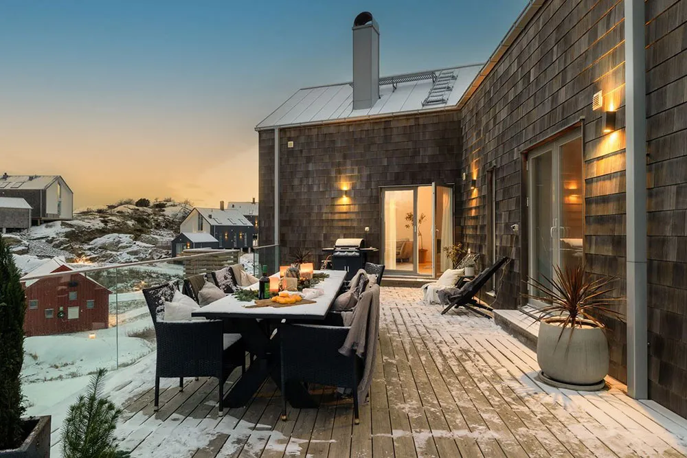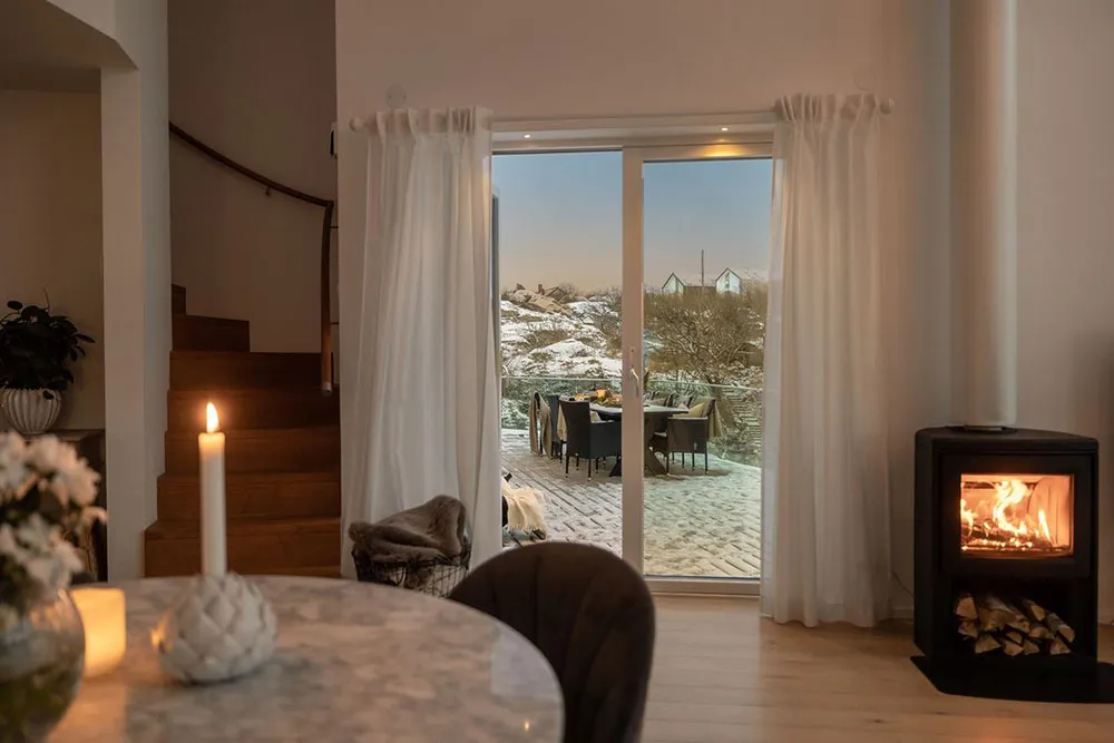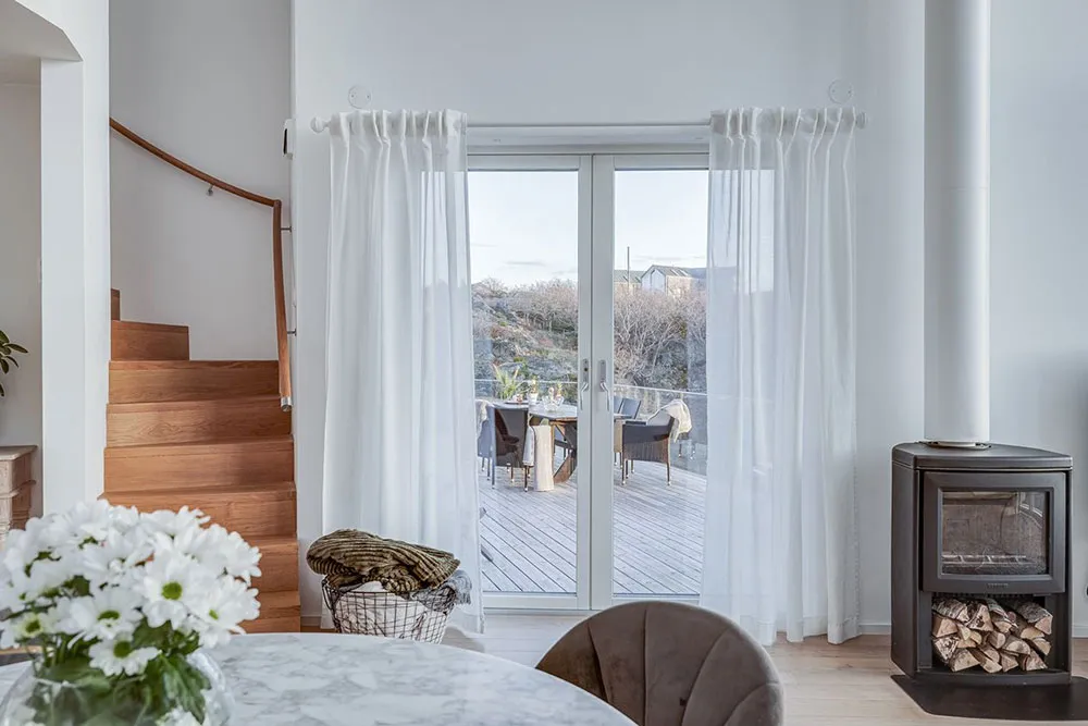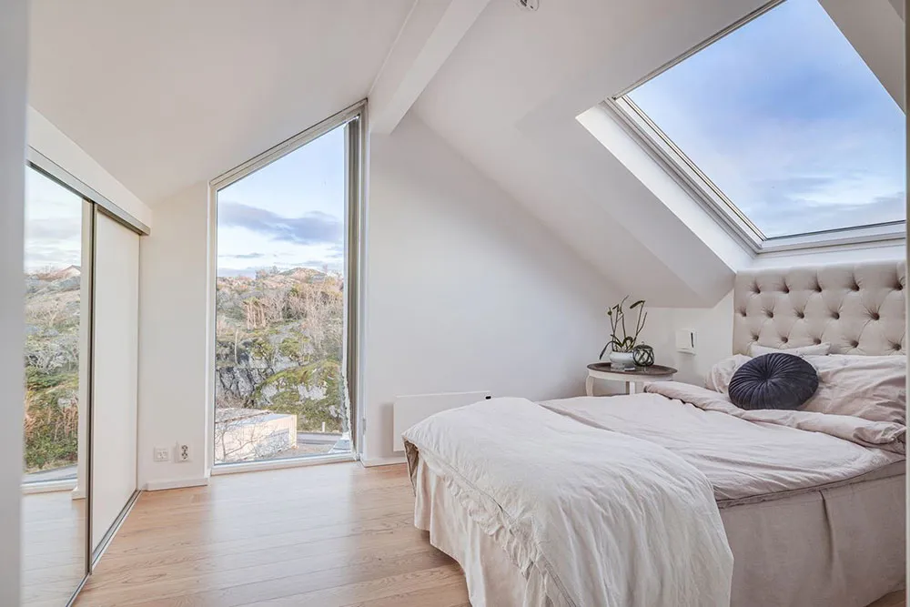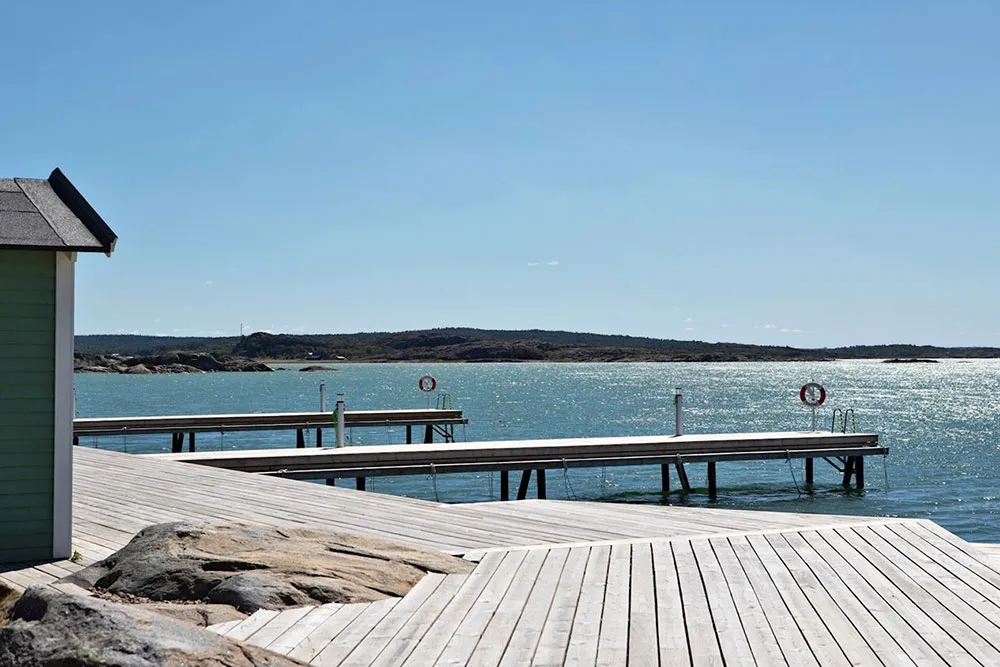 スウェーデンにあるこのモダンなコテージの窓からは、バルト海沿岸の険しい石だらけの風景がその美しさを存分に映し出しています。