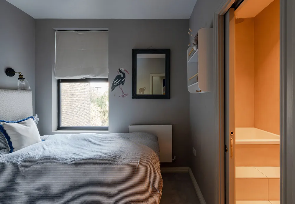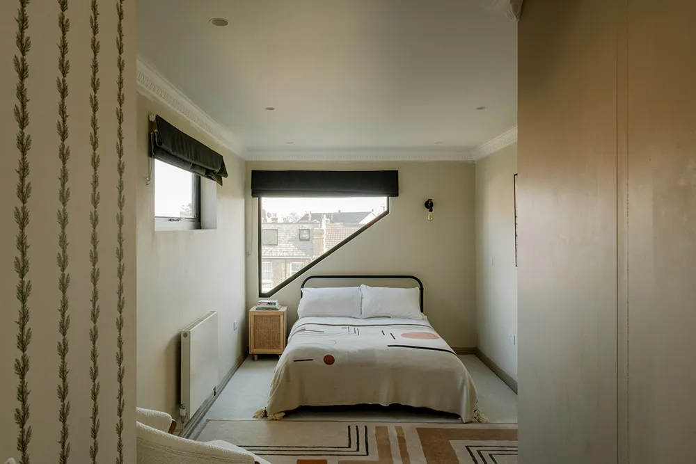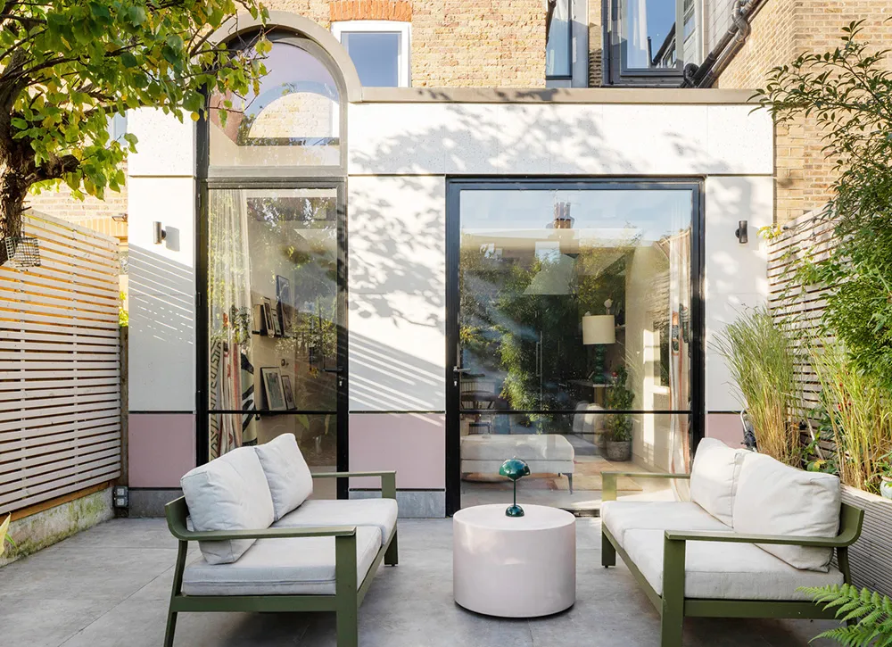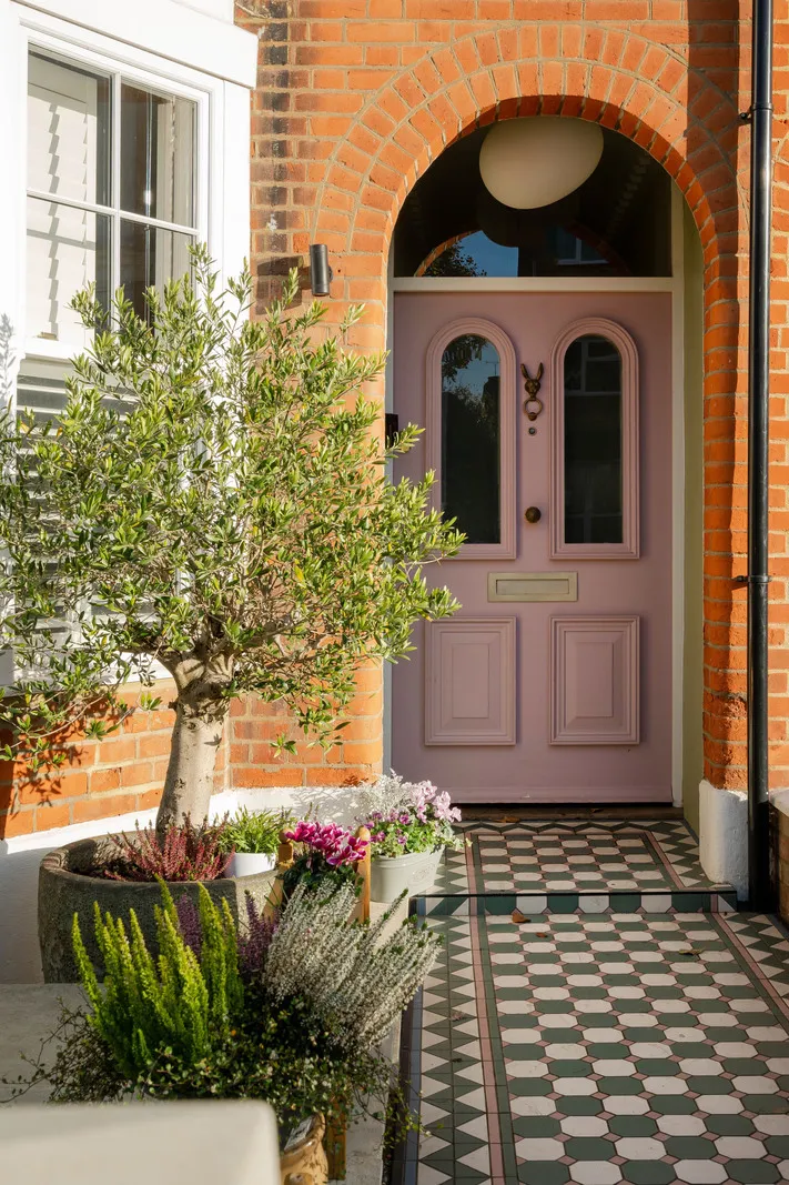 通りから見ると、ロンドンにあるこのエドワード朝様式のコテージは、控えめで整然とした外観をしています。赤レンガの壁、白いベイウィンドウ、そしてメインエントランスにあるアーチが特徴です。