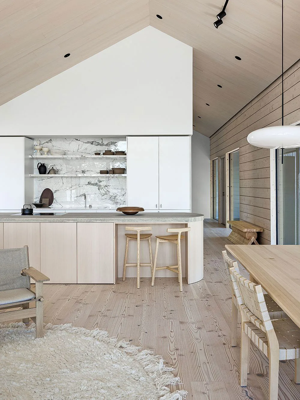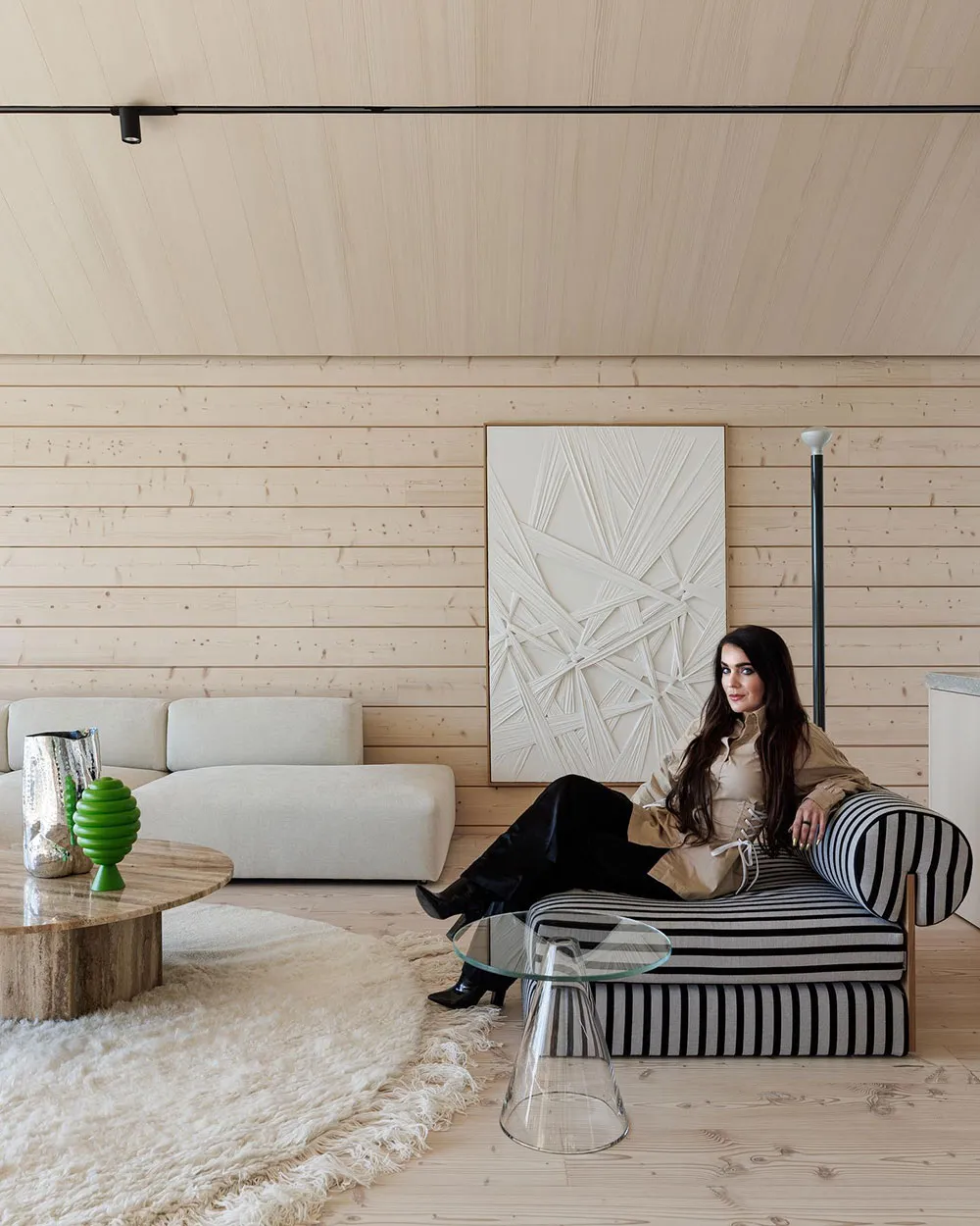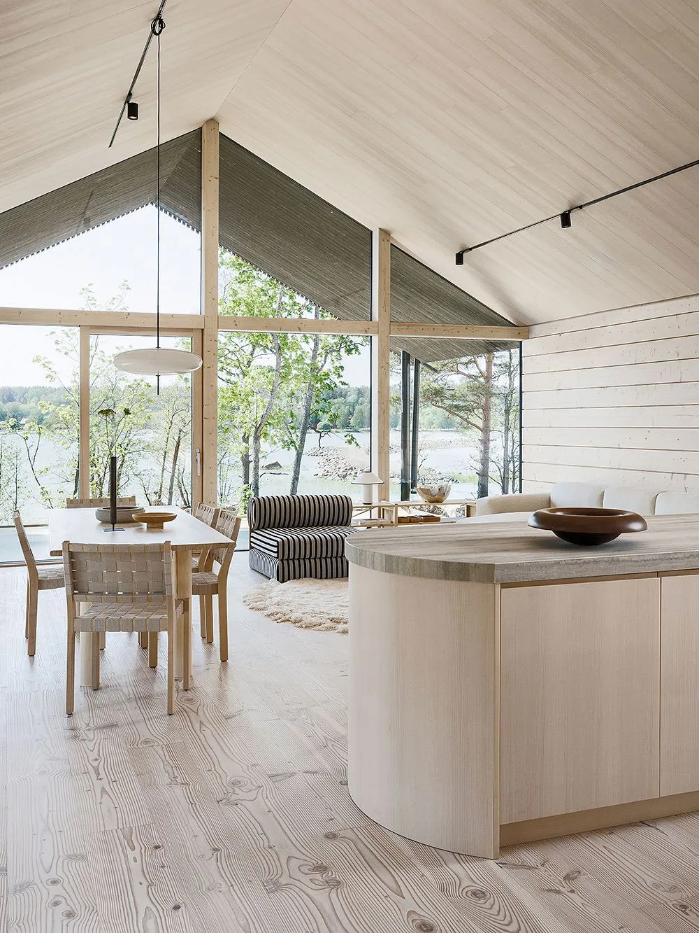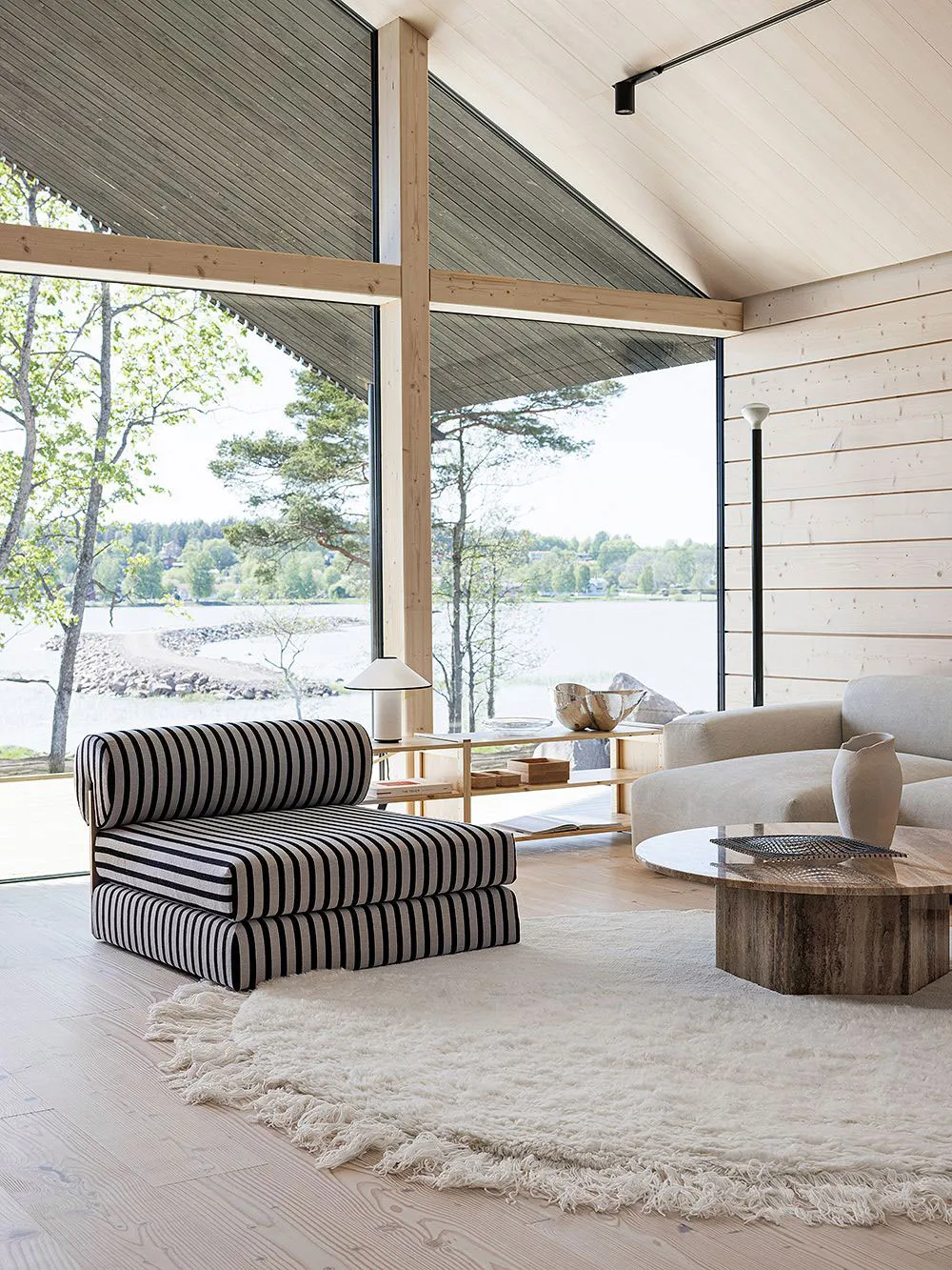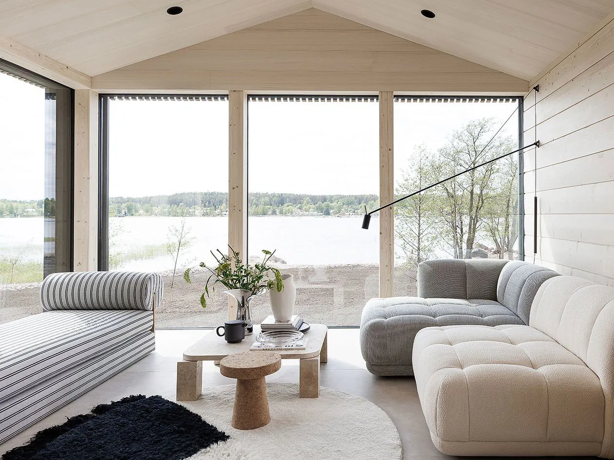 フィンランドの湖畔にあるモダンな丸太小屋の内装で、デザイナーのローラ・セッパネンは柔らかな優雅さという雰囲気を創り出しました。