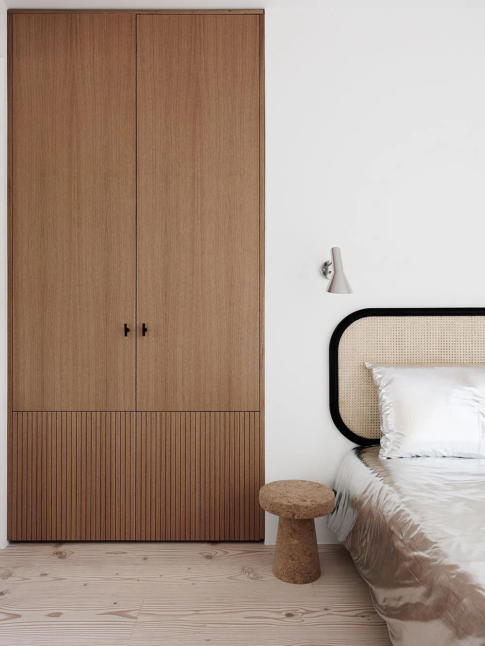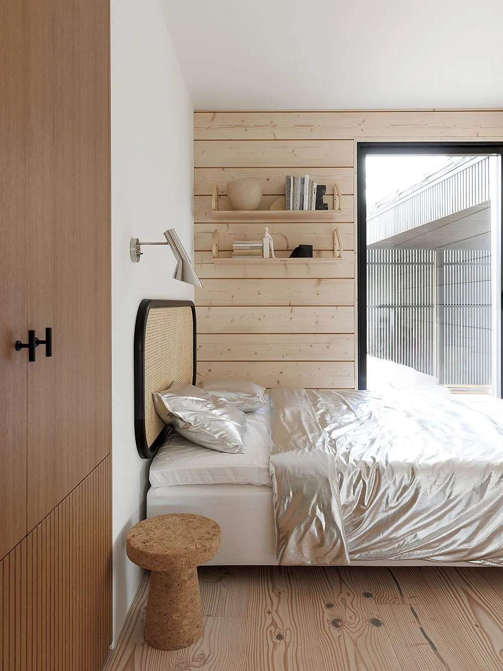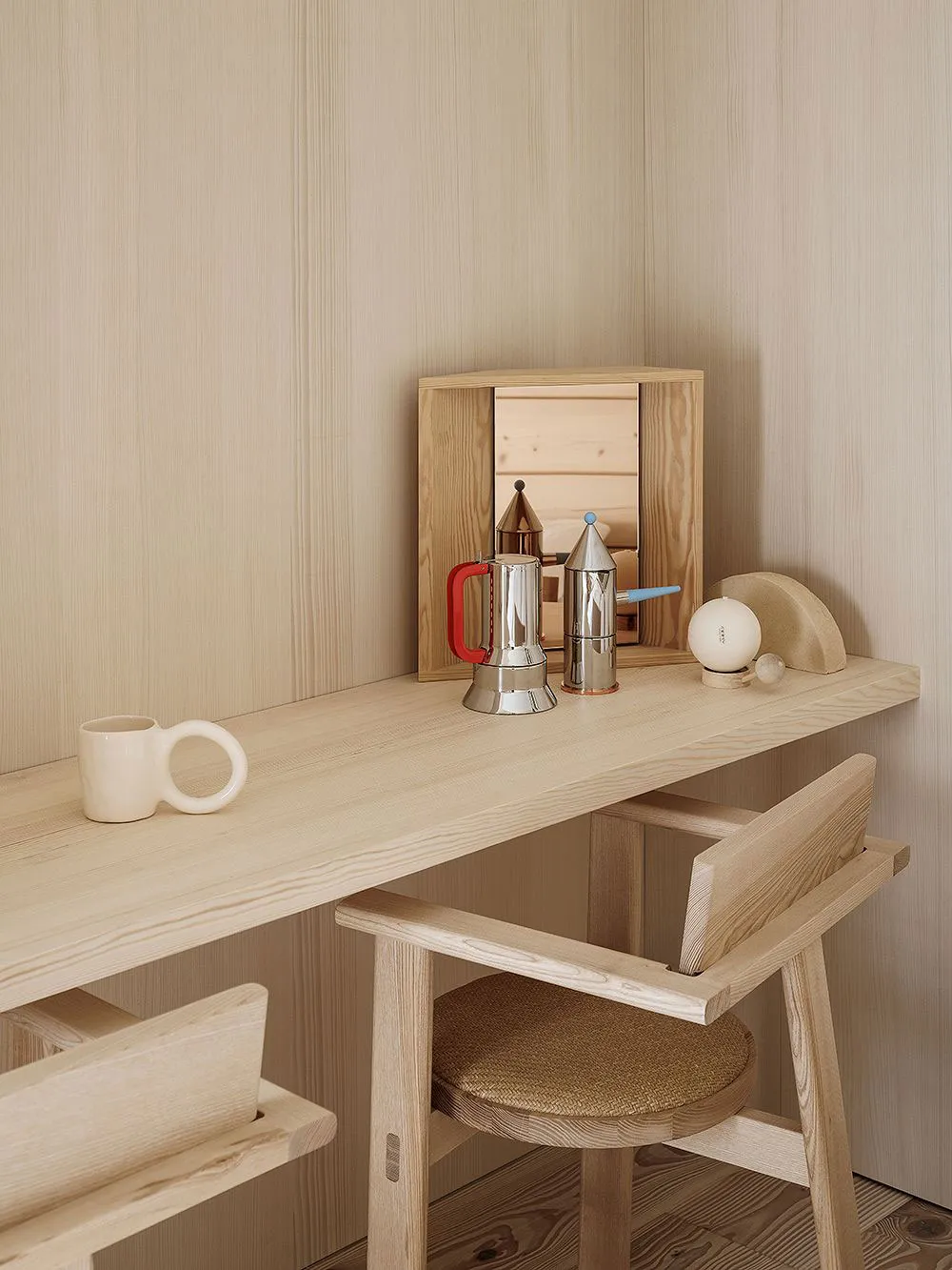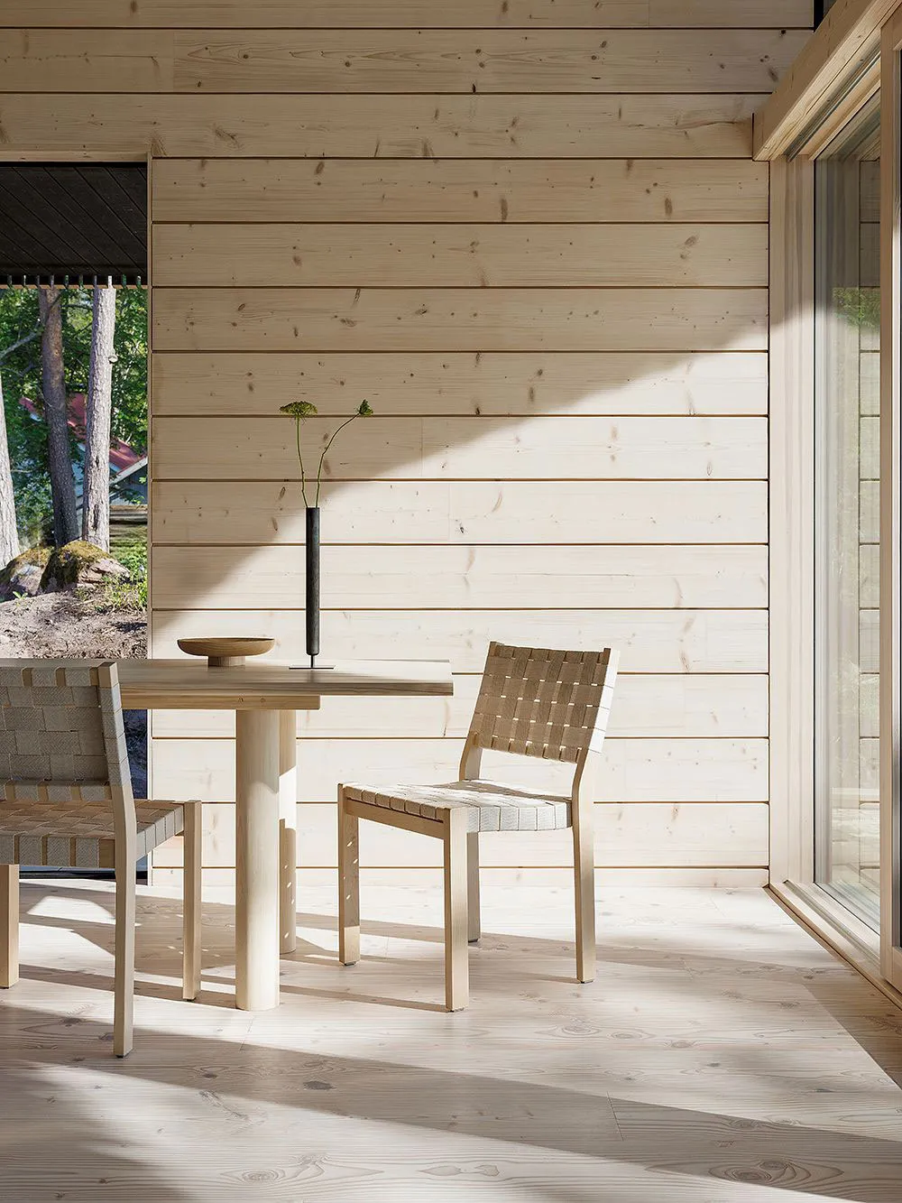 フィンランドの湖畔にあるモダンな丸太小屋の内装で、デザイナーのローラ・セッパネンは柔らかな優雅さという雰囲気を創り出しました。