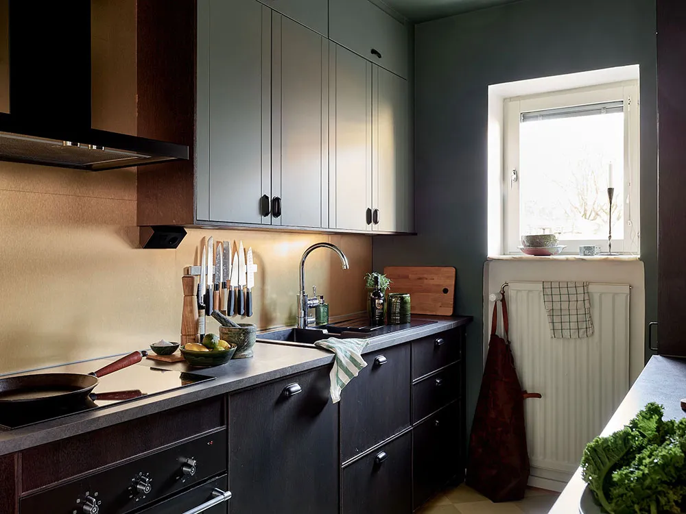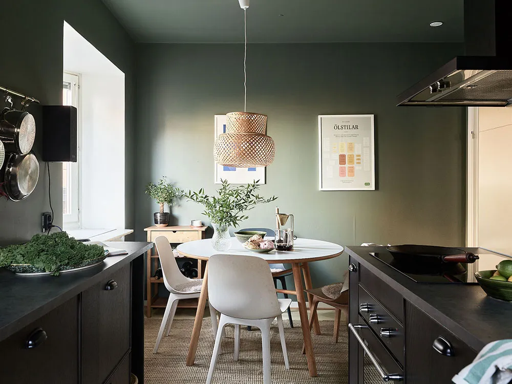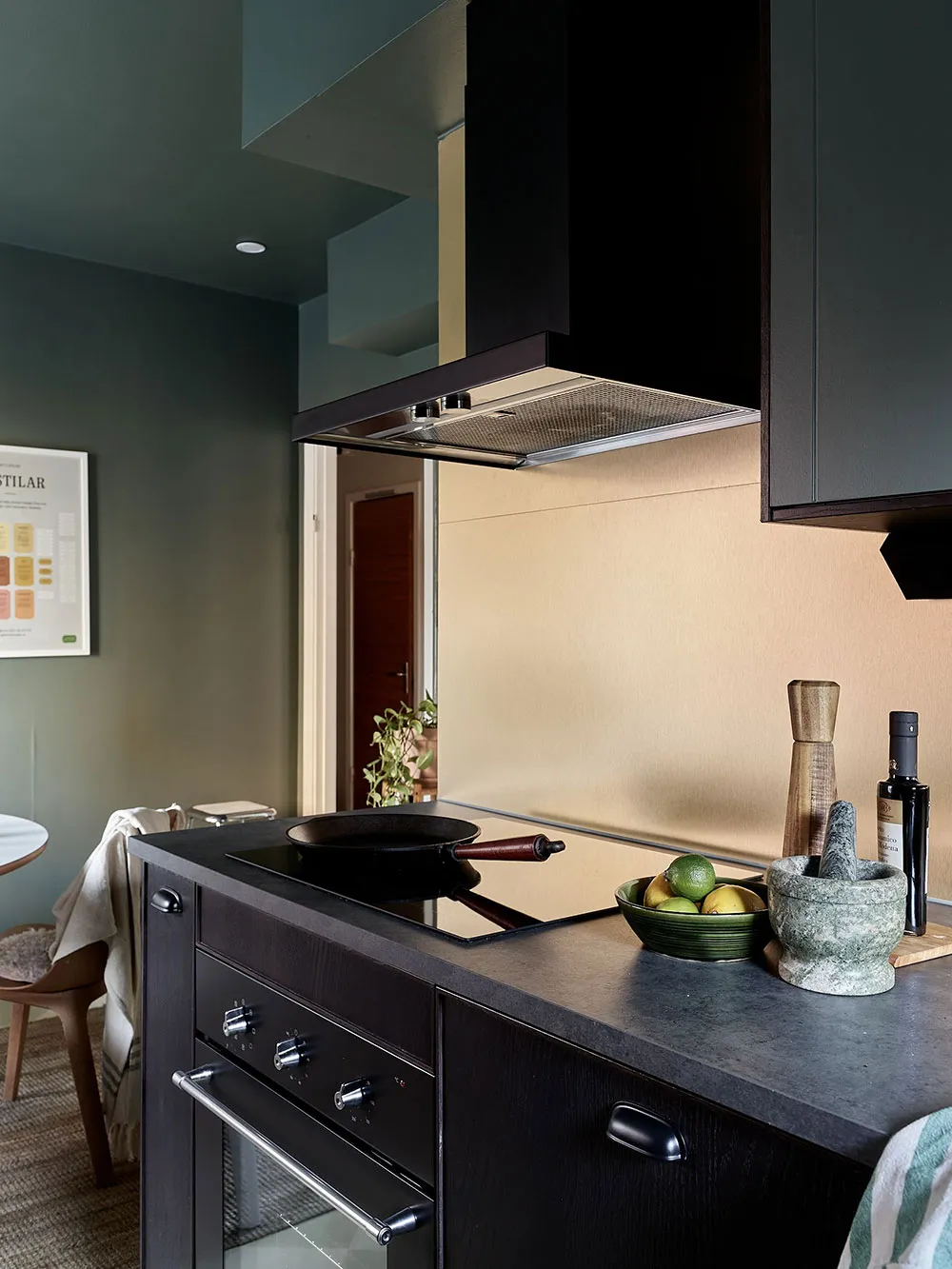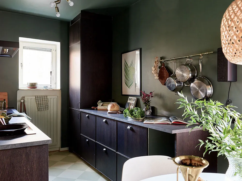 ヨーテボリの70平方メートルの住居で、アトモスフェリックなダークグリーン色のキッチンを備えたインテリアデザイン