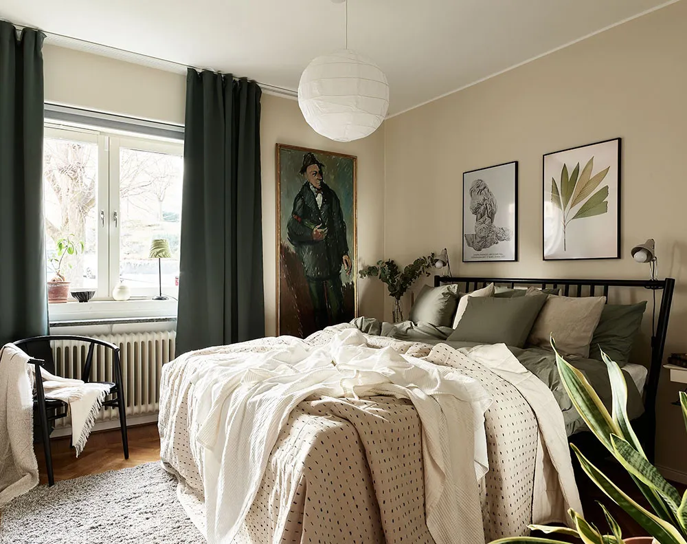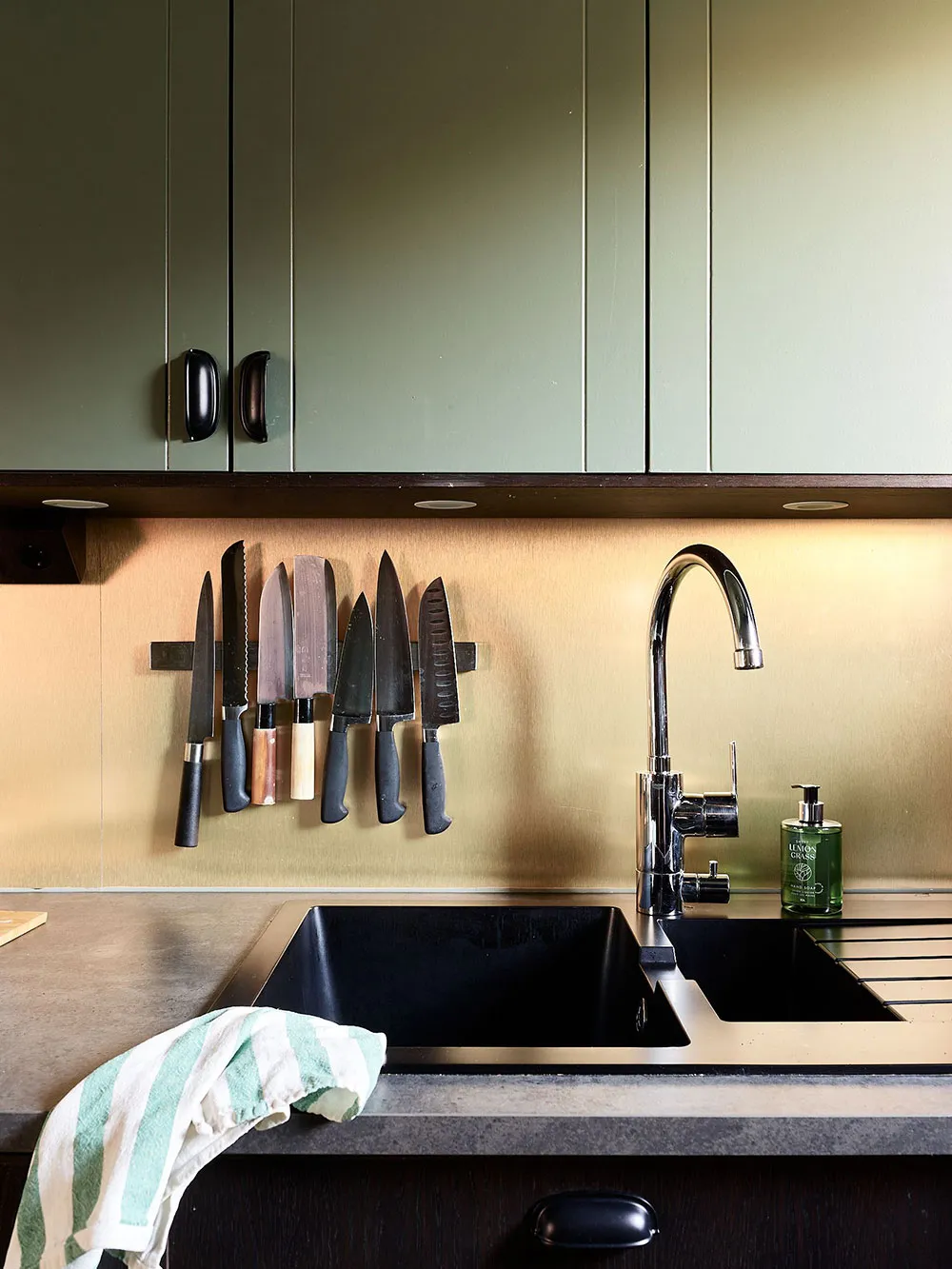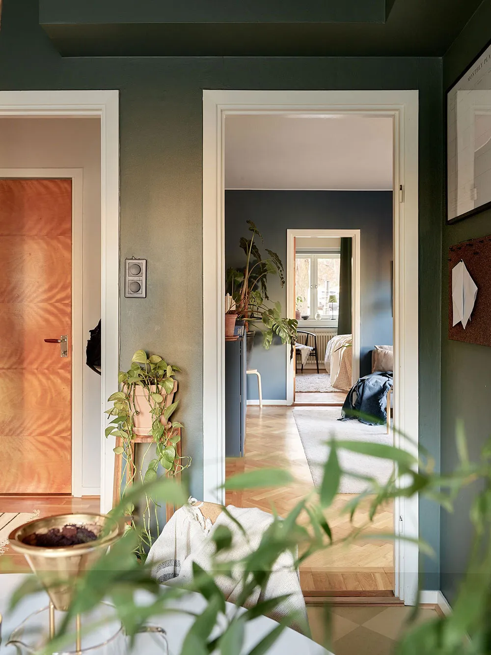 ヨーテボリの70平方メートルの住居で、アトモスフェリックなダークグリーン色のキッチンを備えたインテリアデザイン