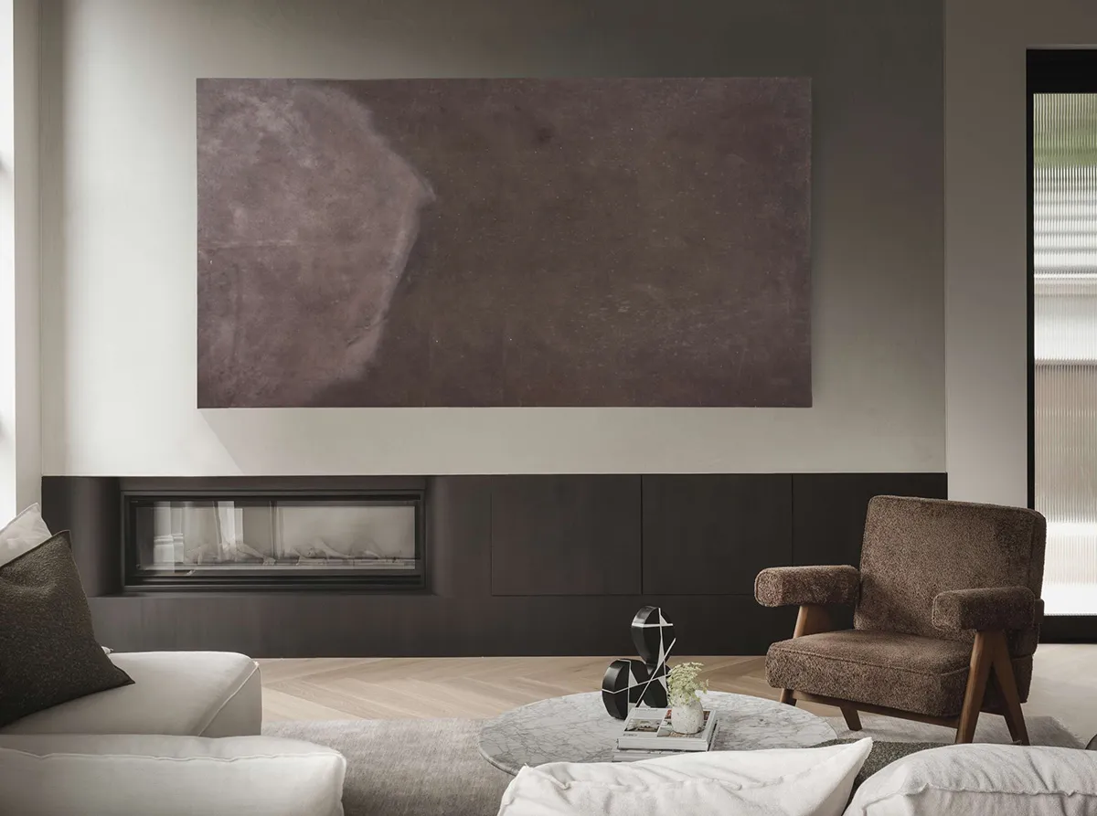 メルボルンのモダンなインテリアにおいて、ブラックキッチンがスタイリッシュなアクセントとして機能している