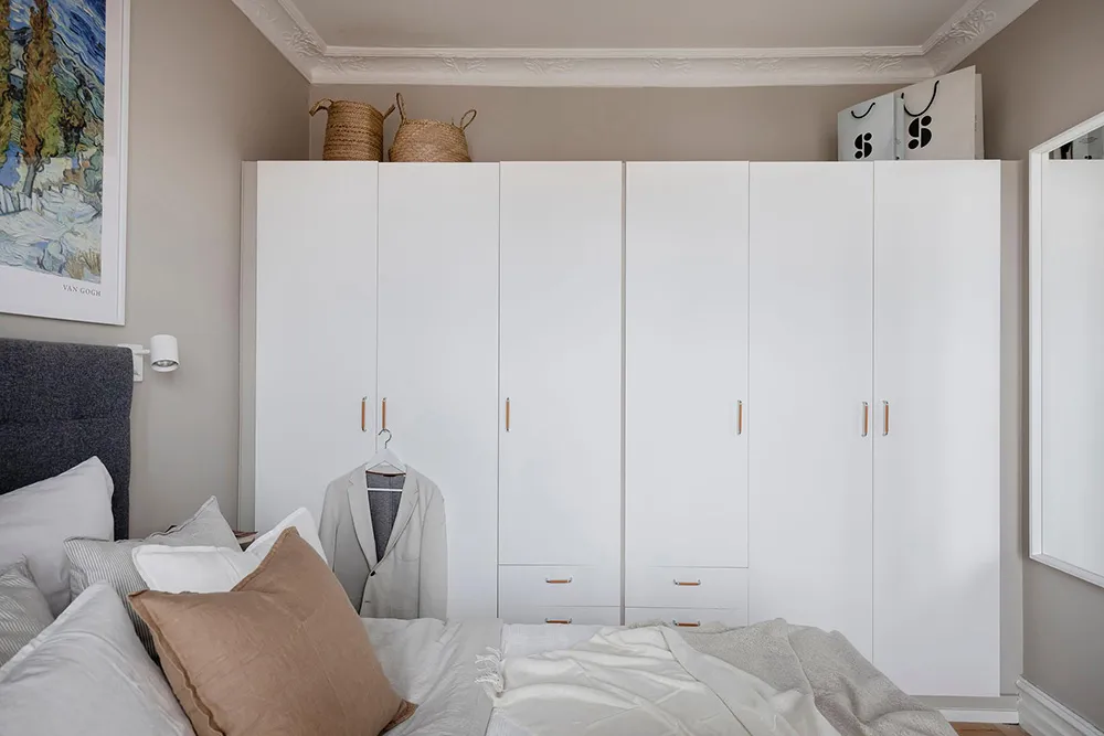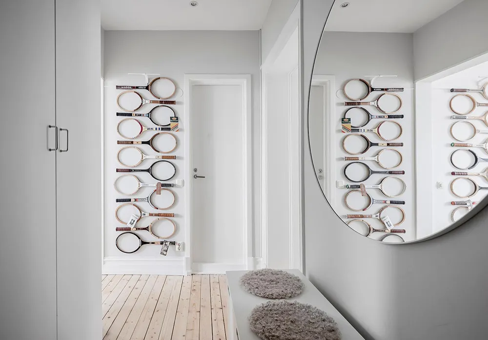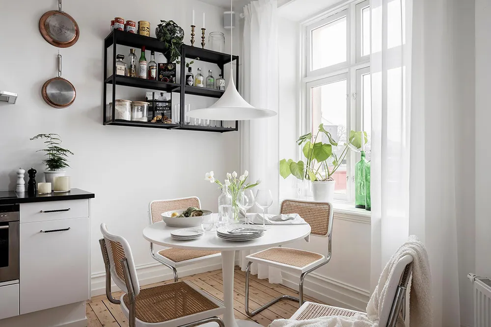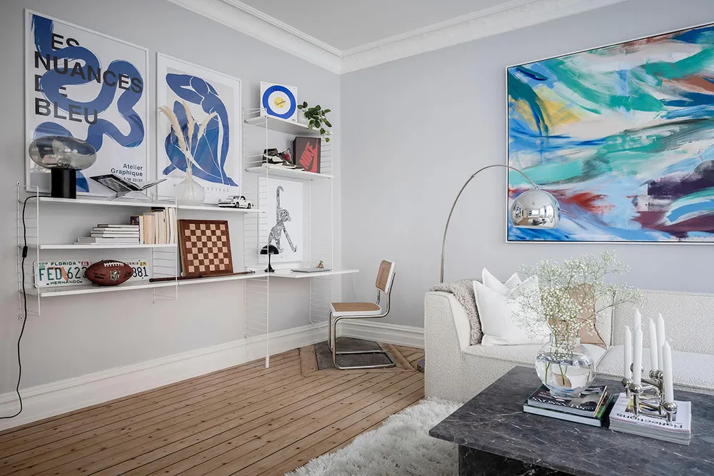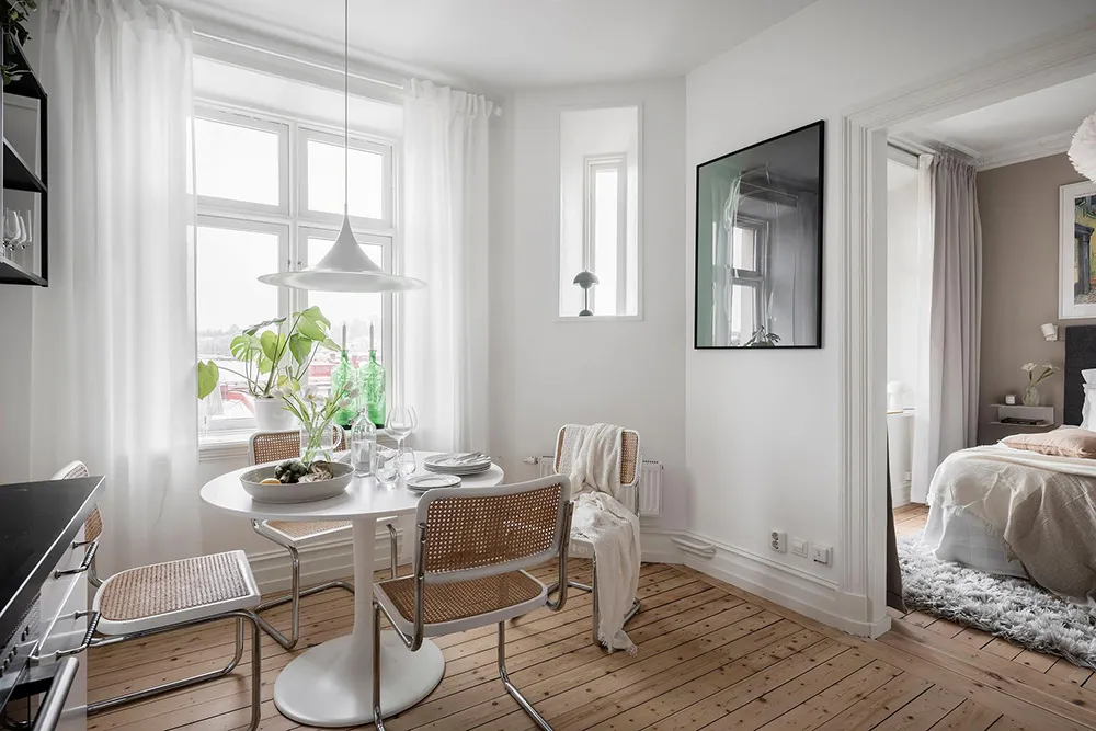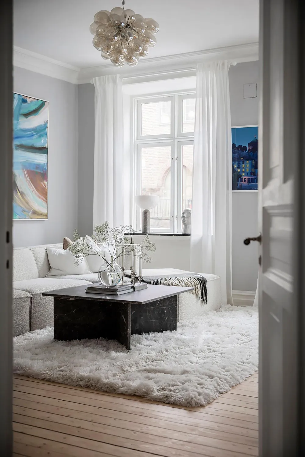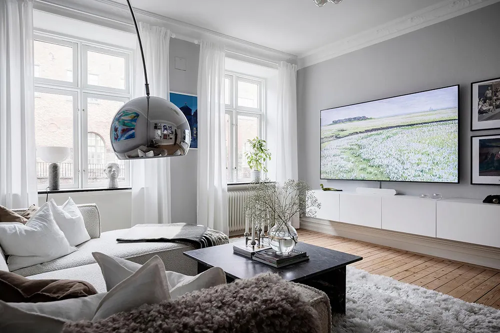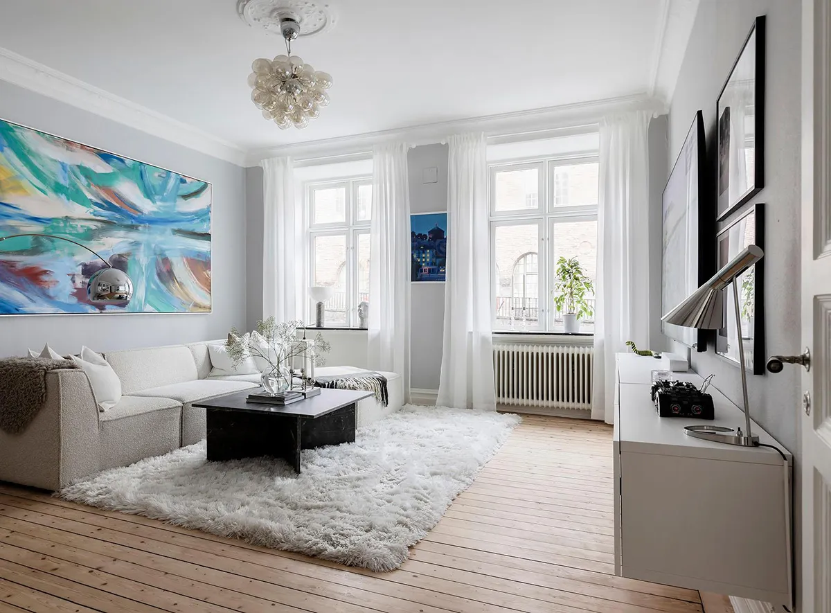 このスカンジナビア風のインテリアでは、白が全体を支配しています。枕付きのソファ、カーペット、カーテン、内蔵式の家具など、至る所で白が使われています。