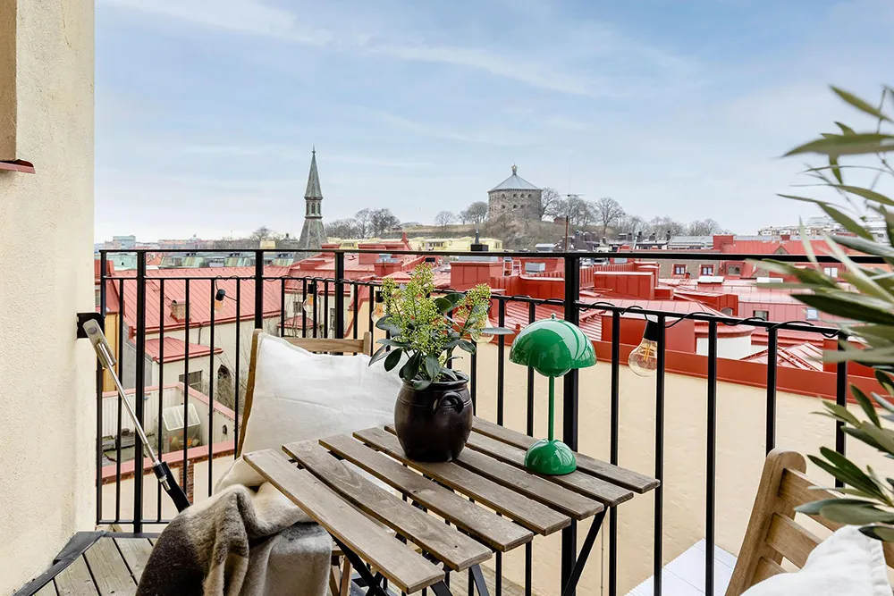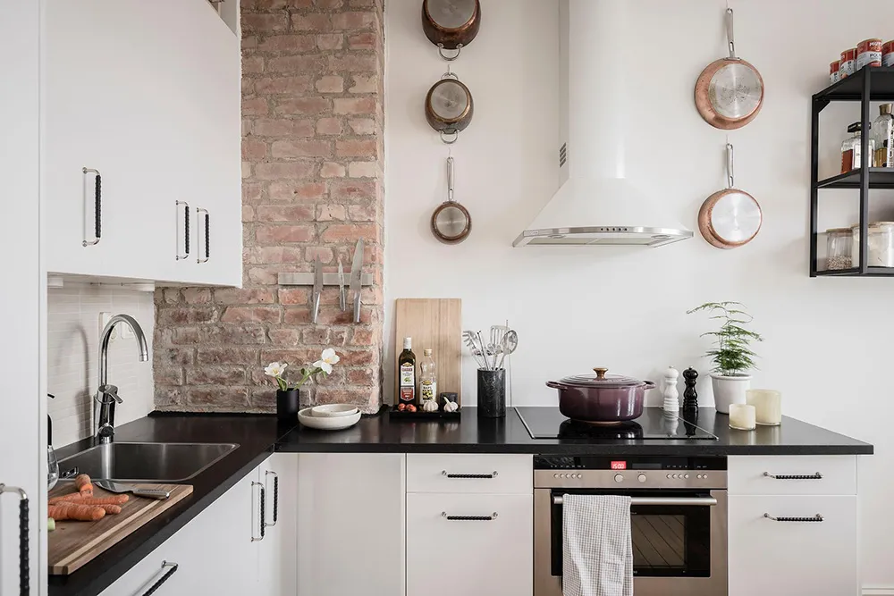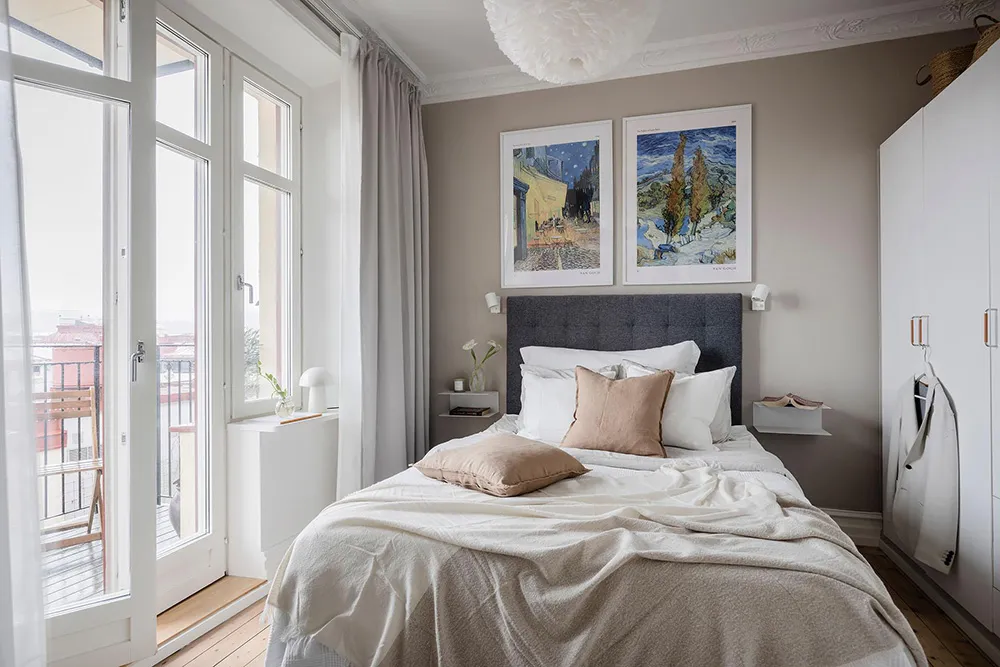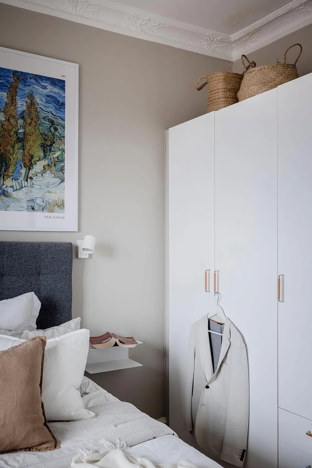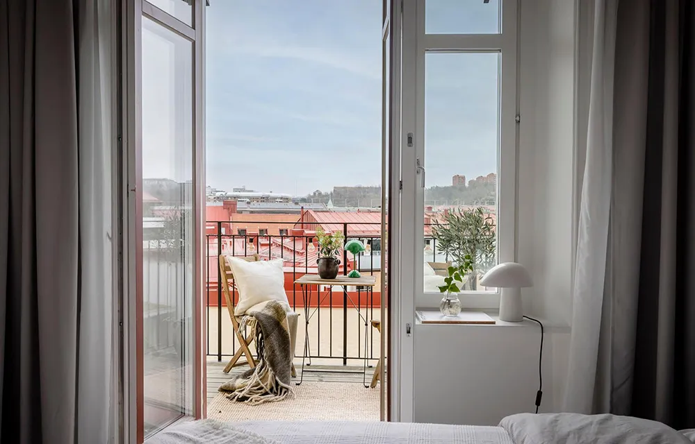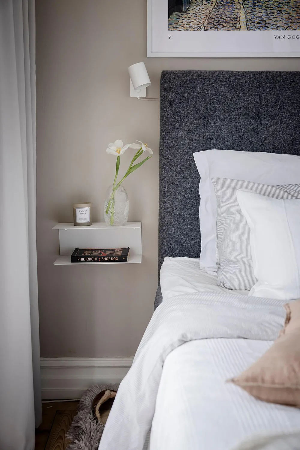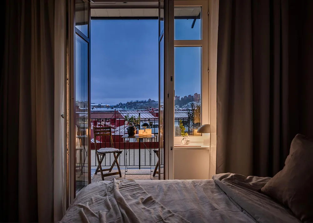 このスカンジナビア風のインテリアでは、白が全体を支配しています。枕付きのソファ、カーペット、カーテン、内蔵式の家具など、至る所で白が使われています。