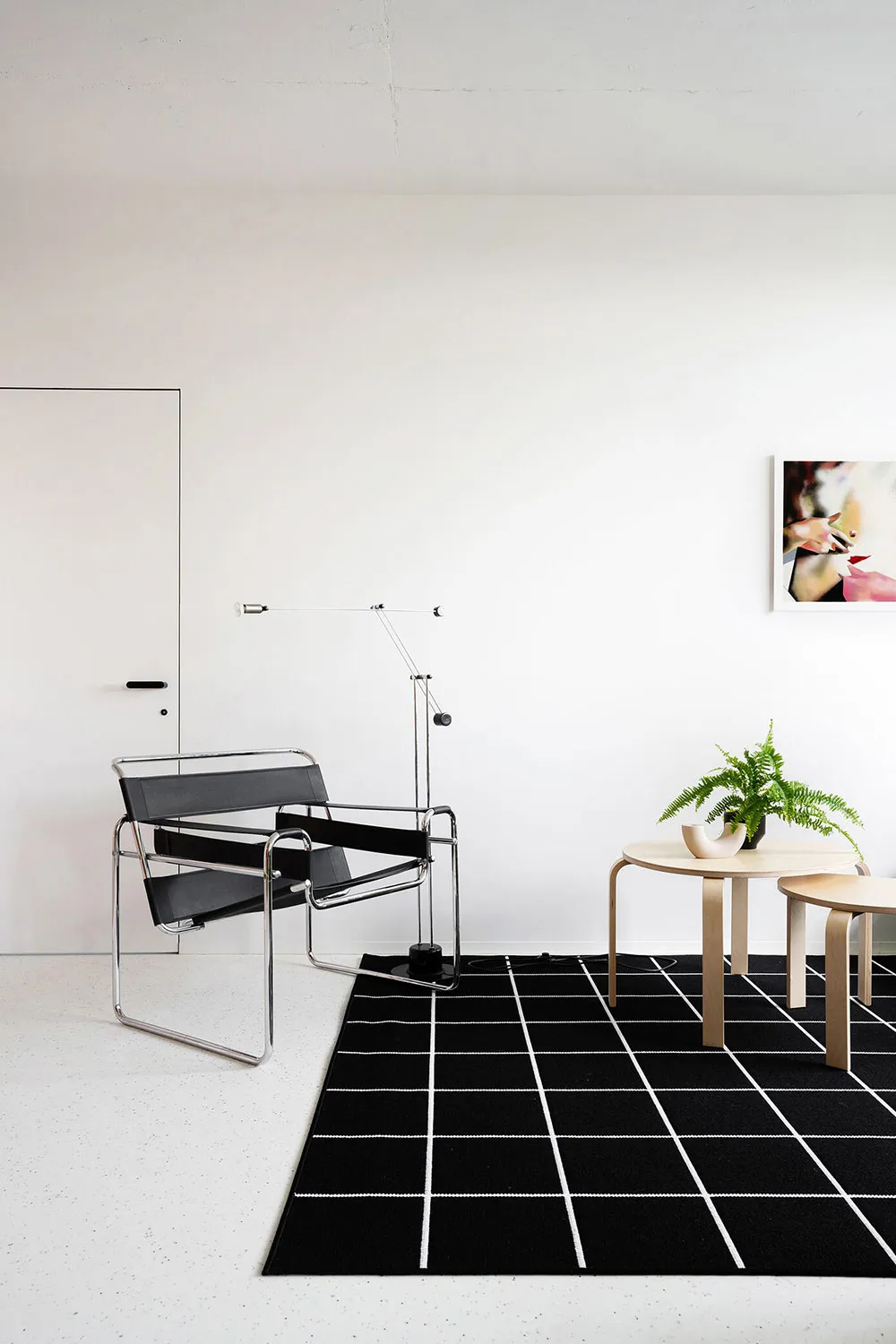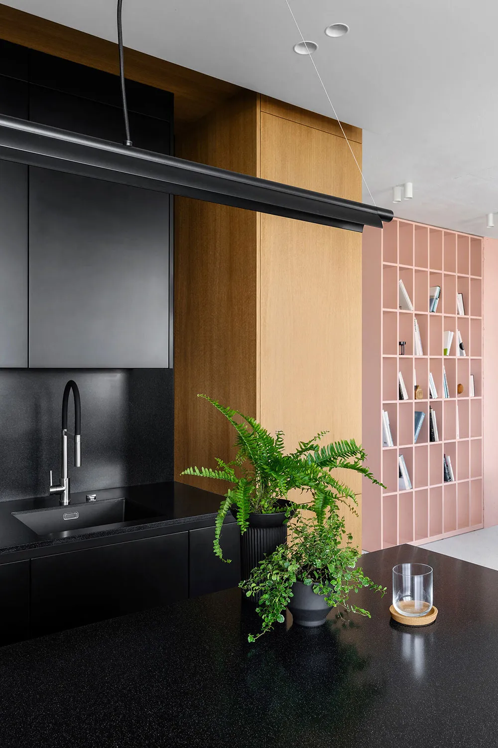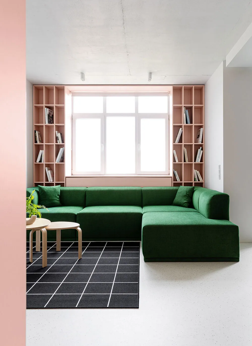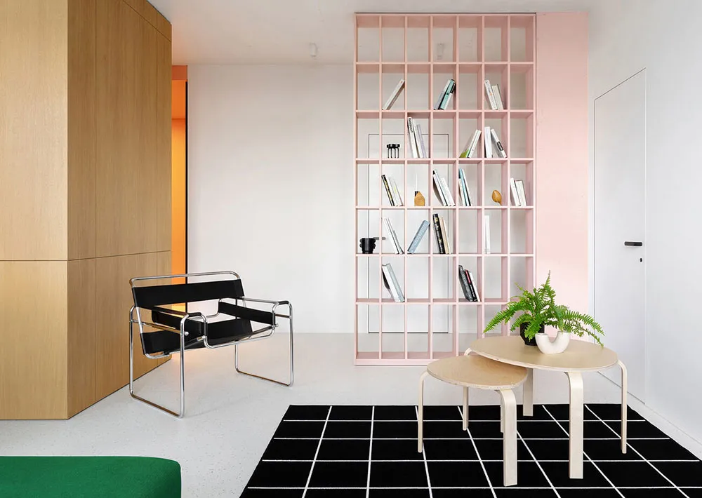 キーウにある85平方メートルの空間で、色彩豊かな家具を使った活気あふれるミニマリズムスタイル