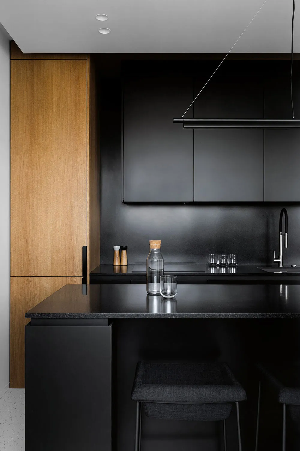 美しい森の中にあるキャビンで、スタイリッシュな黒と白の内装です。