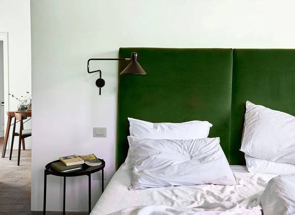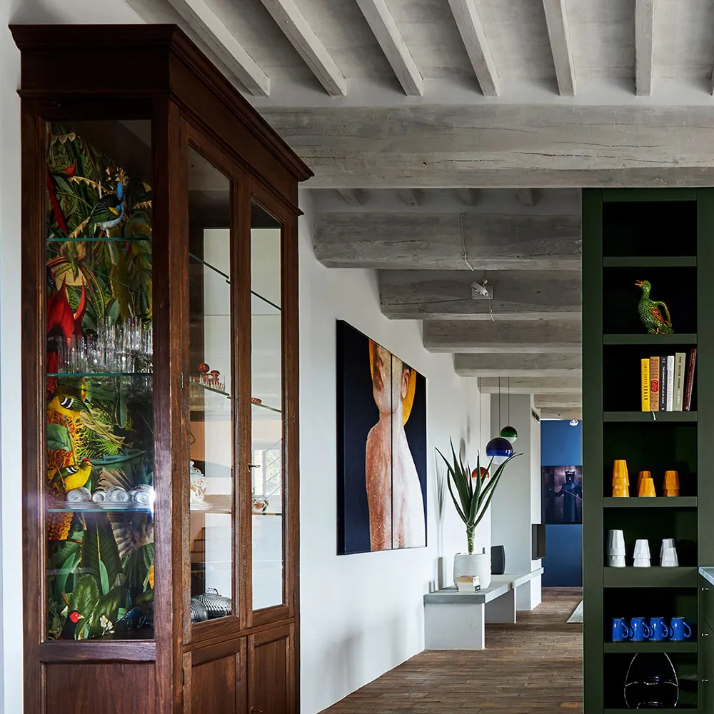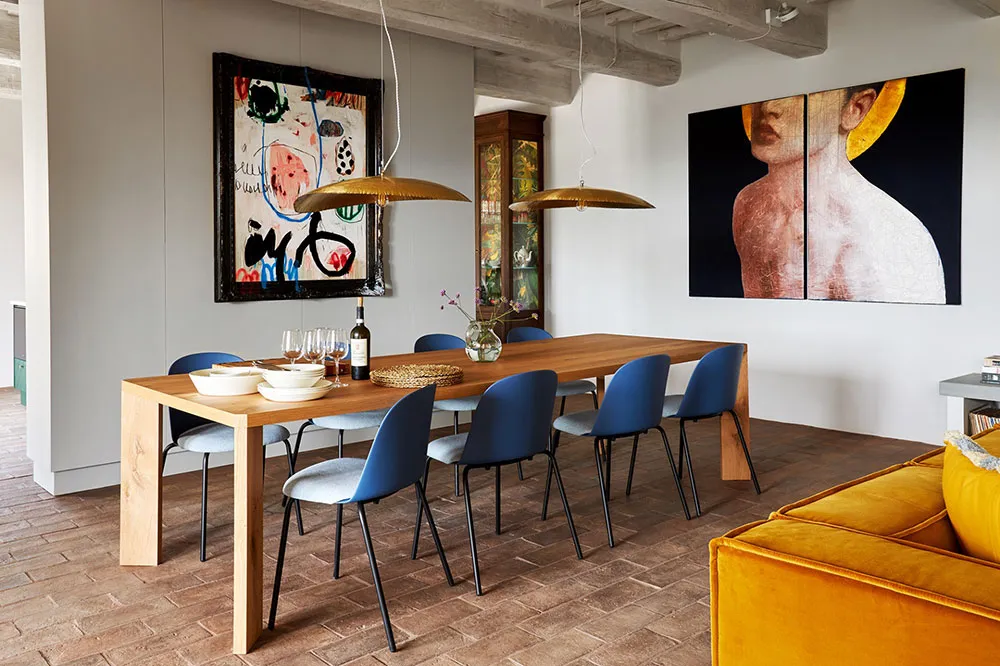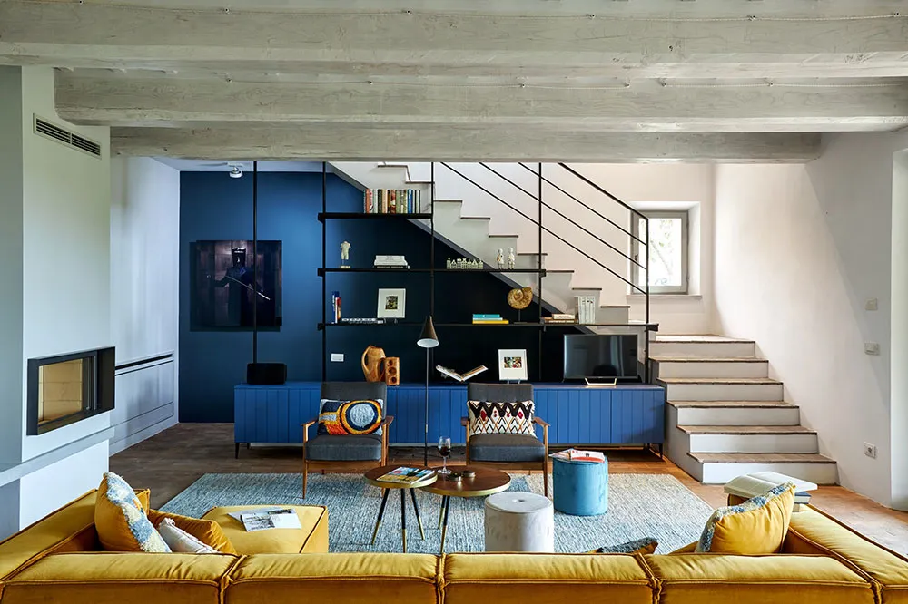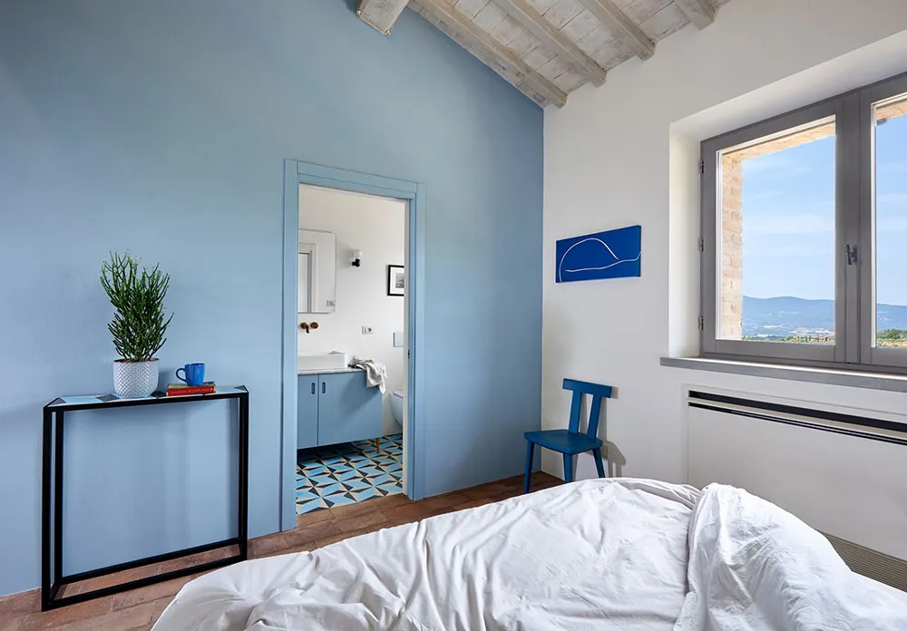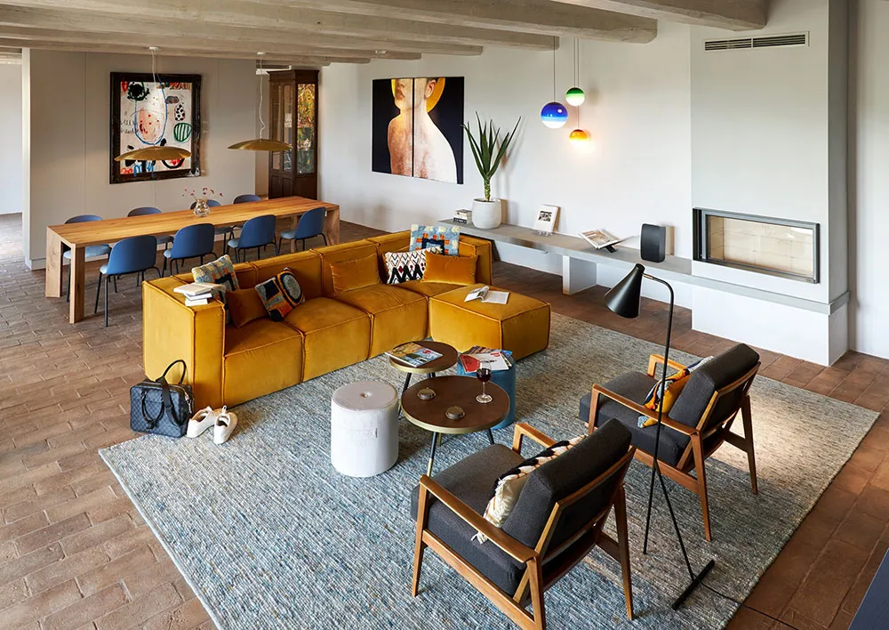 ウンブリア州にある歴史的な石造りのヴィラの、鮮やかでモダンなインテリア
