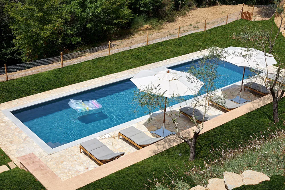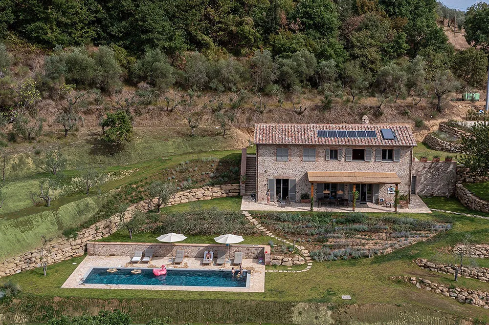 外から見ると、イタリアのウンブリア州にあるこのヴィラは、地元の伝統的な建築様式と変わらない。何世紀も前に建てられた石造りのファサード、居心地の良いポーチ、テラコッタ色の屋根、そして敷地を囲むオリーブの木々が特徴だ。