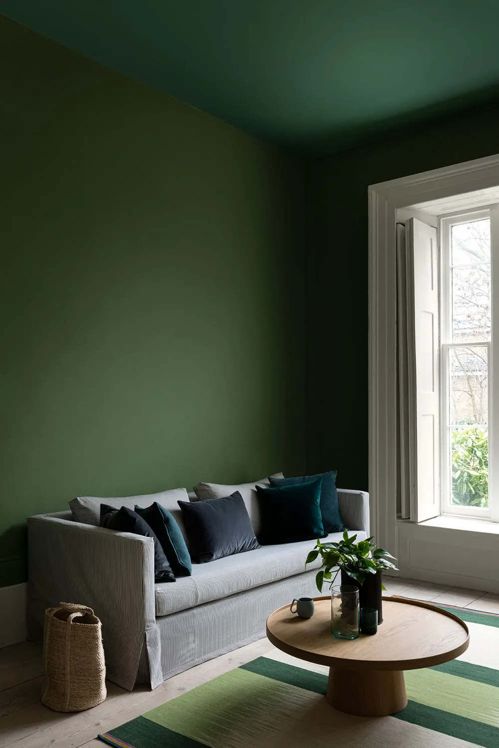 緑の壁があるドラマチックなスカンジナビア風インテリア