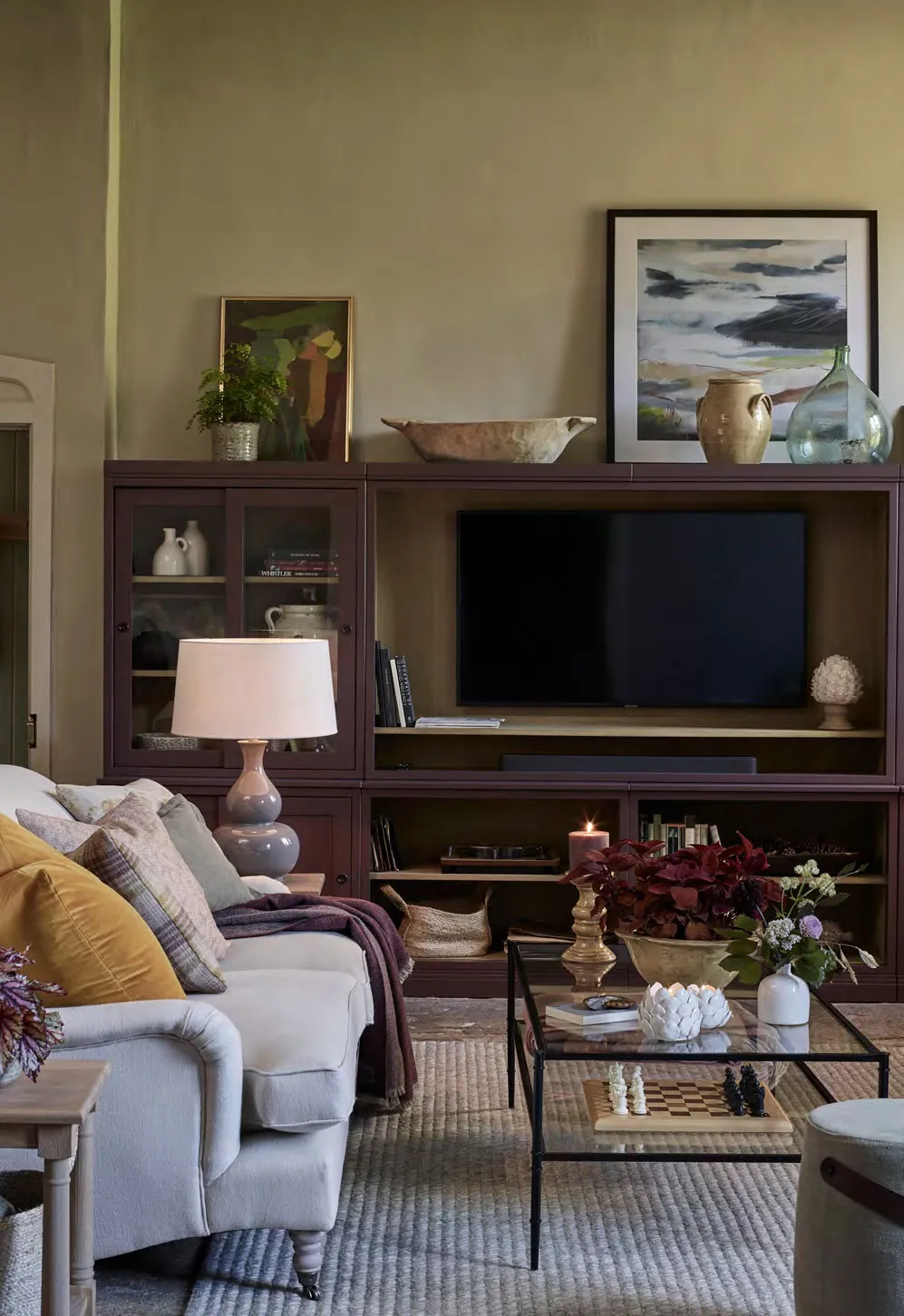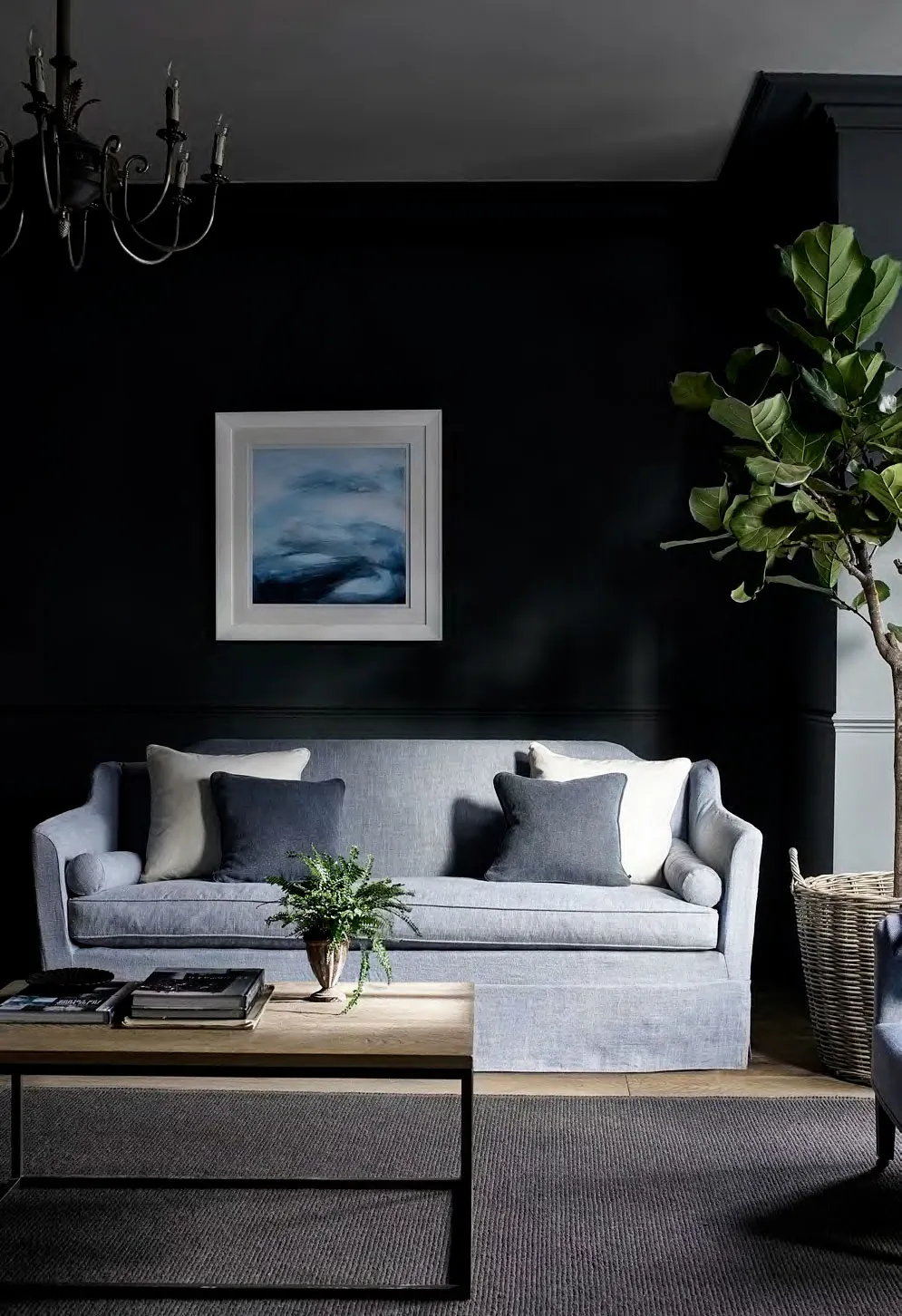 スウェーデンのアパート(71平方メートル)にある、効果的なデザインで居心地の良いダーク調のリビングルーム