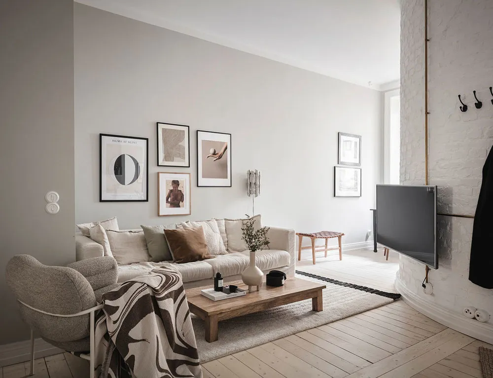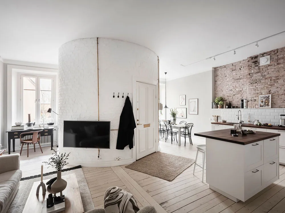階段の周りにリビングルームがある、珍しいスカンジナビア風のアパートメント(63平方メートル)