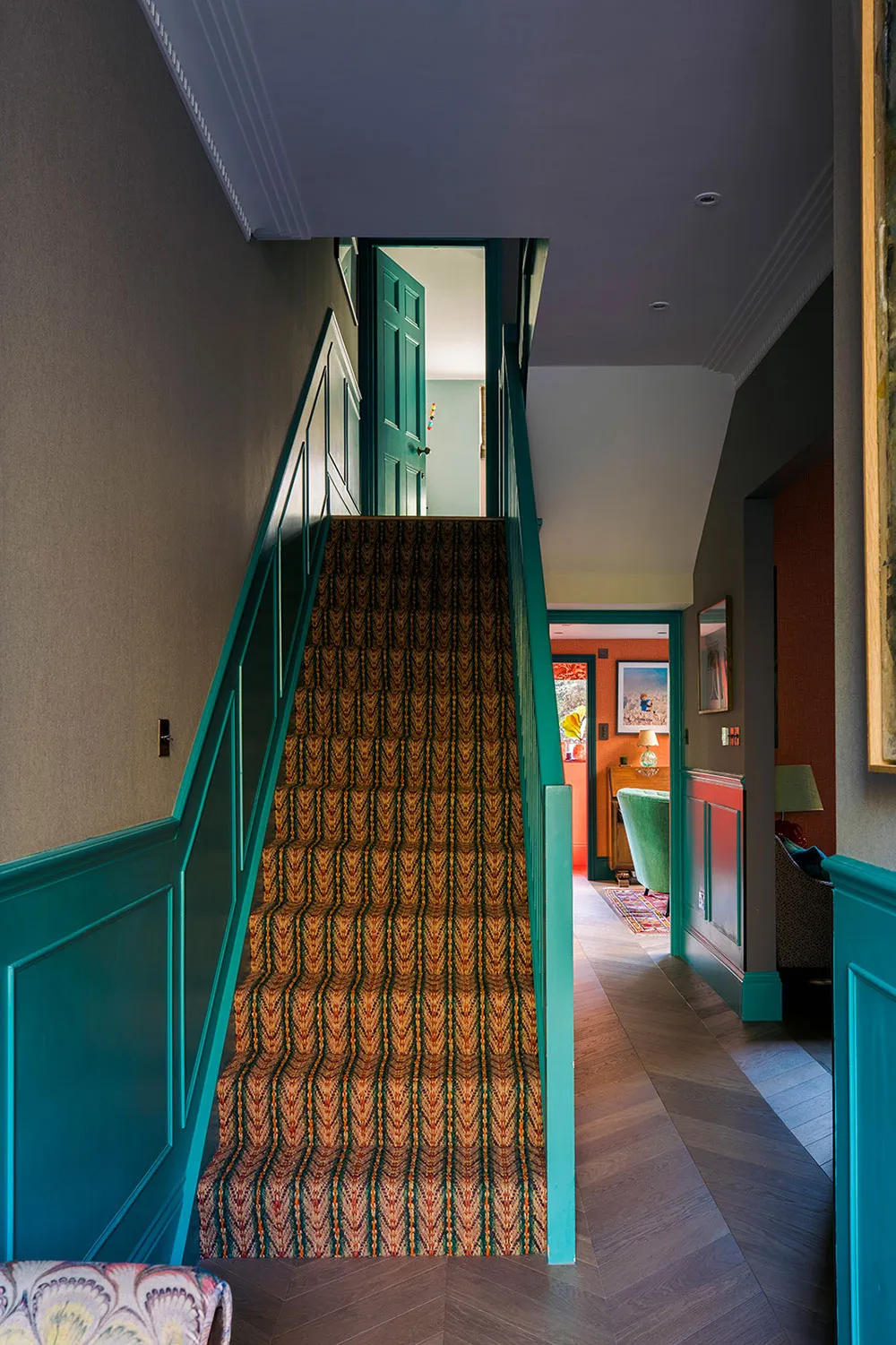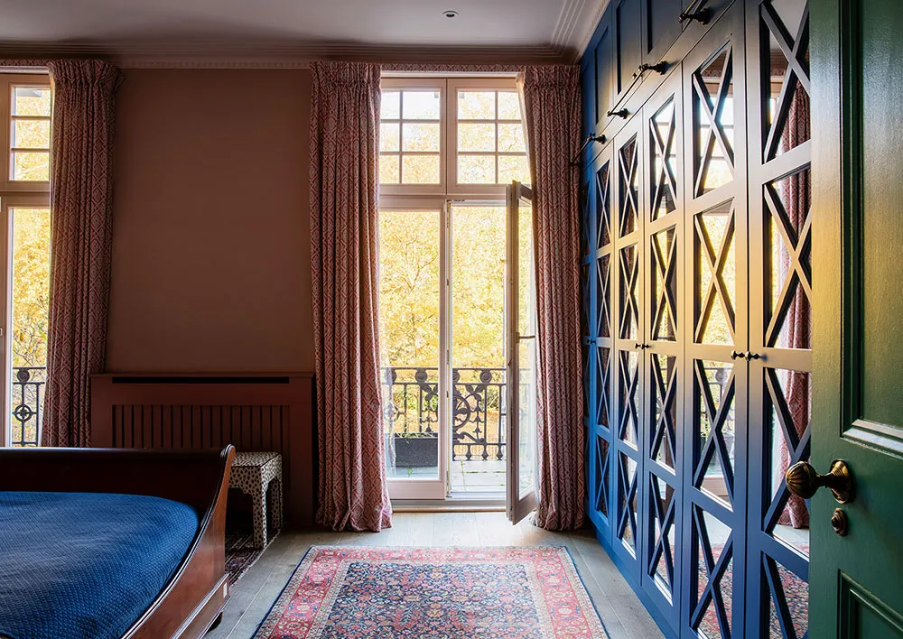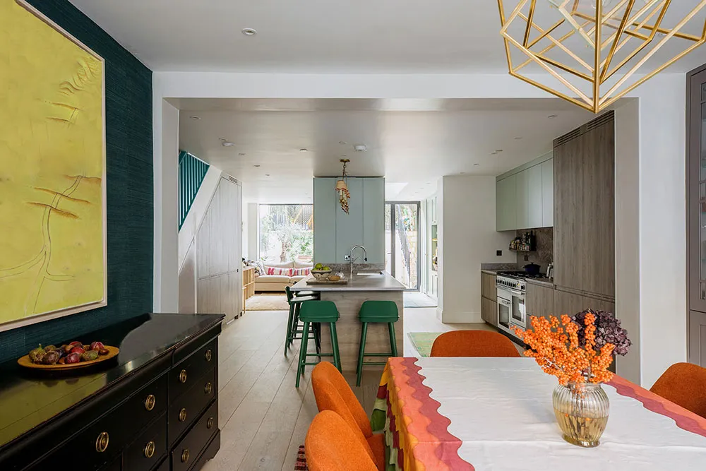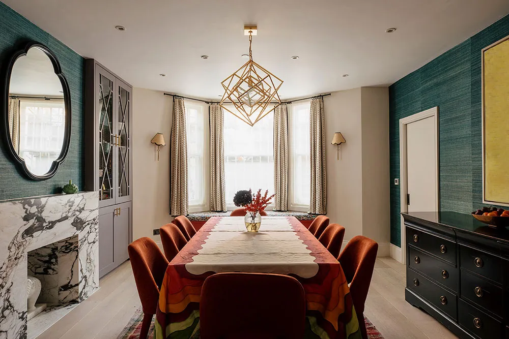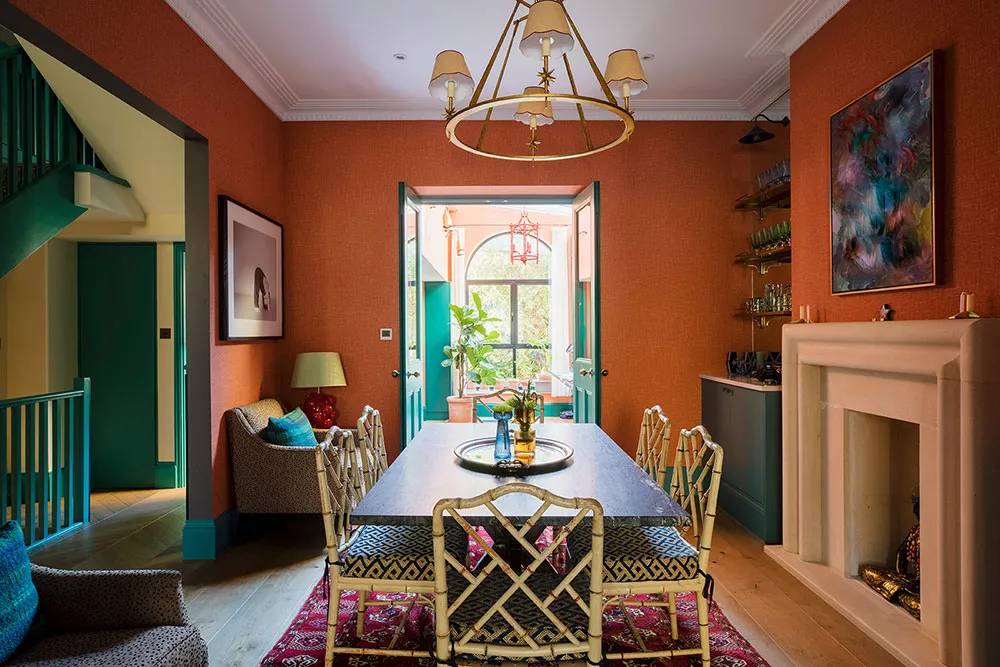 ロンドンにあるタウンハウスの内装は、色彩が豊かなだけでなく、デザイナーたちが慎重に選んだユニークで時には驚きを与える色合いが使われています。