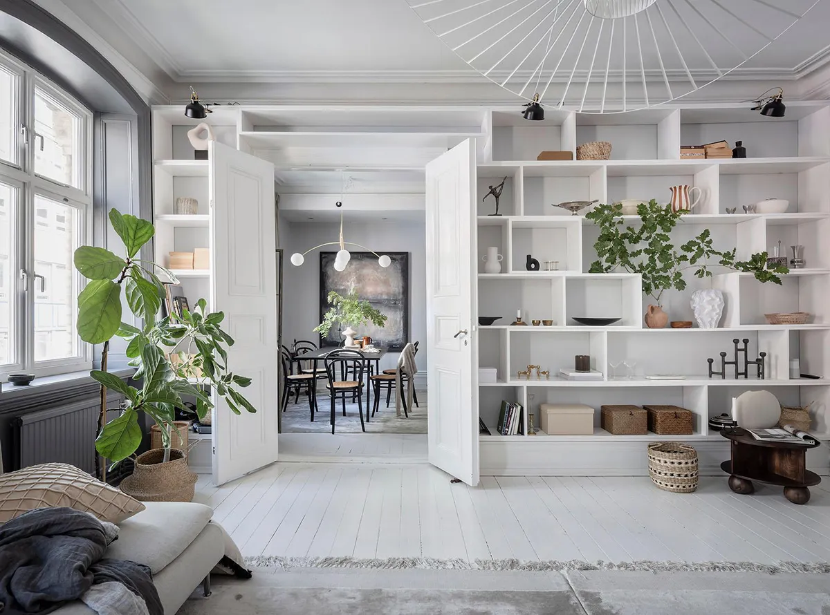 Elegancki skandynawski wnętrze z otwartymi półkami i nowoczesnymi szarymi akcentami (74 m²)
