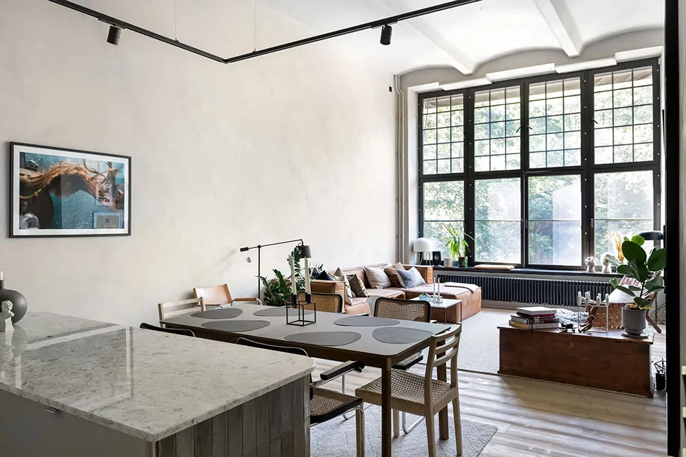 Jasny loft w Stokholmie z luksusowymi przemysłowymi oknami