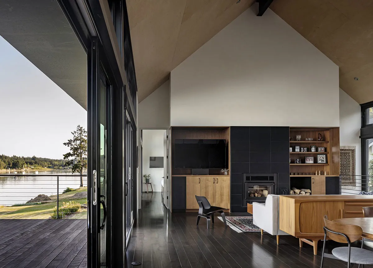 Stylowy domek przy jeziorze z czarnym fasadem i dostępem do wody