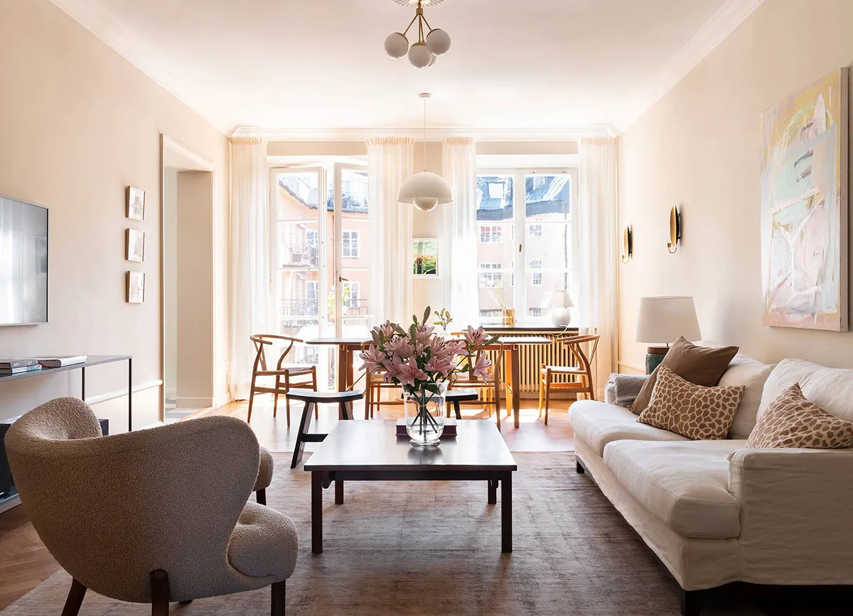 Przyjemne beżowe odcienie w дизайне słończnej mieszkania w Stokholmie