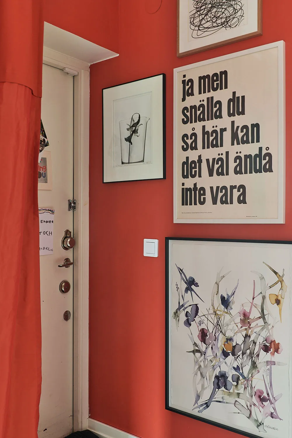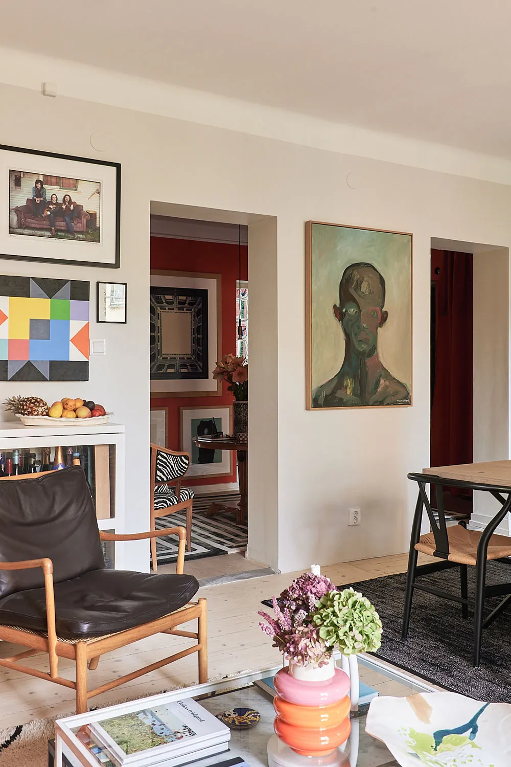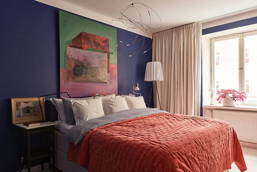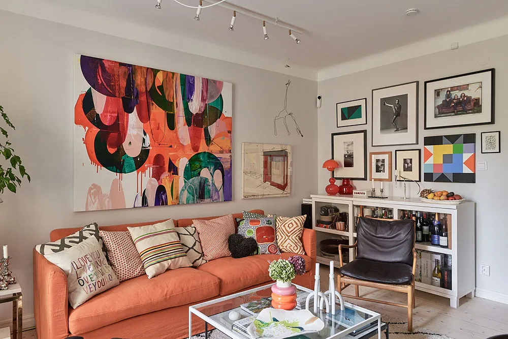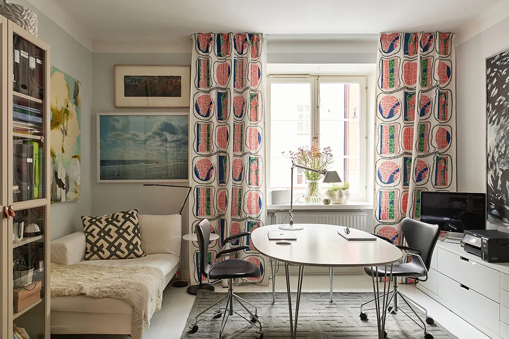 Jaśne kolory i ręcznie wykonane wzory stwarzają kreatywny nastrój w tym szwedzkim mieszkaniu.
