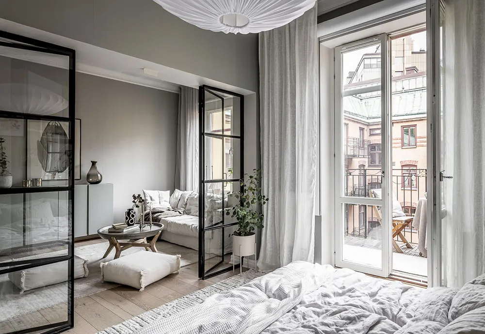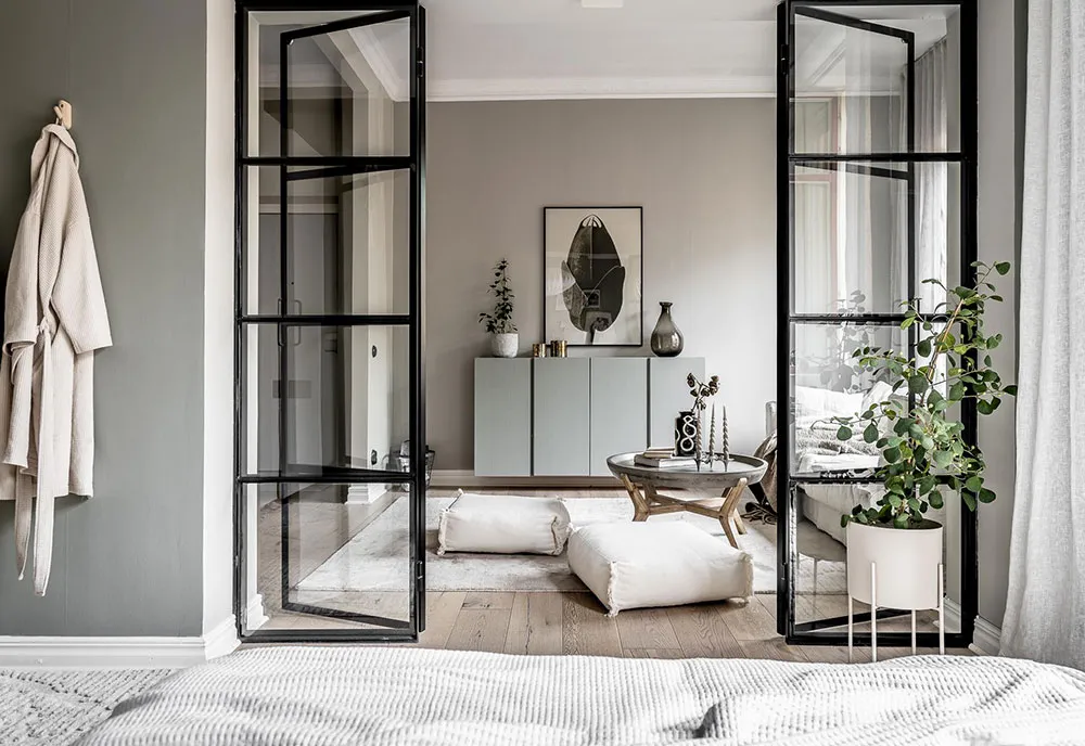 Szklane drzwi i "zziemiona" łóżko: spokojny интерьер małego mieszkania (44 m²)