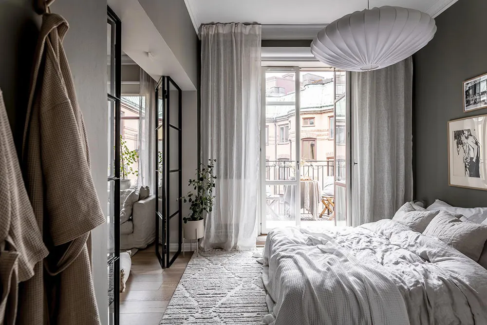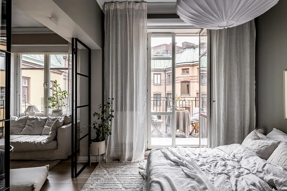 Ciemne odcienie i sypialnia w narożniku: mały mieszkanie w Szwecji (37 m²)