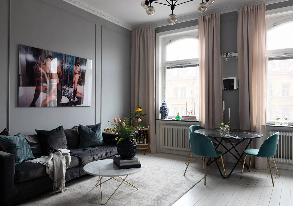 Ciemne odcienie i sypialnia w narożniku: mały mieszkanie w Szwecji (37 m²)
