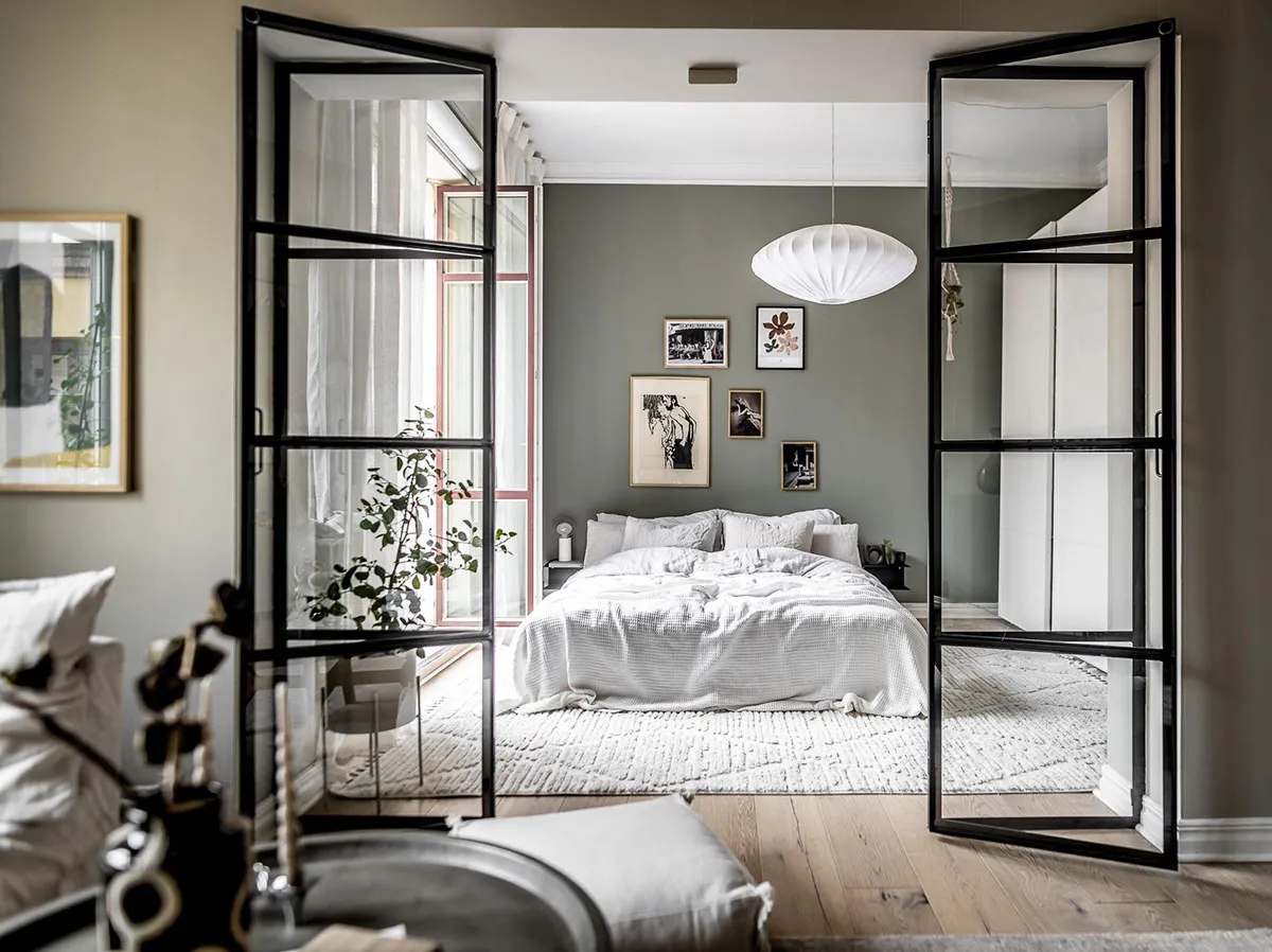 Szklane drzwi i "zziemiona" łóżko: spokojny интерьер małego mieszkania (44 m²)