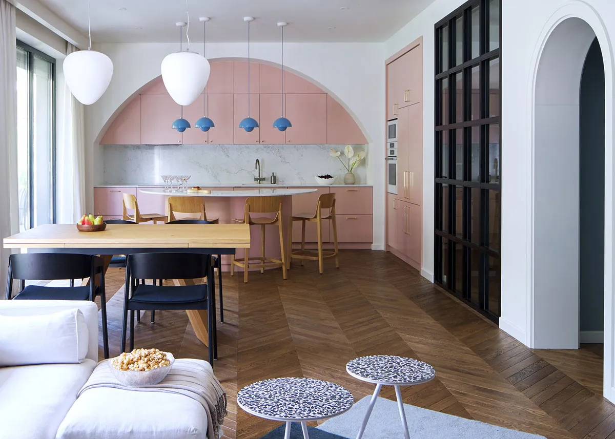 Różowa kuchnia z arką i kolorowymi akcentami: mieszkanie dla młodej rodziny w Almaty