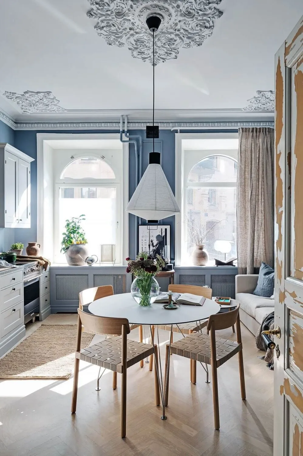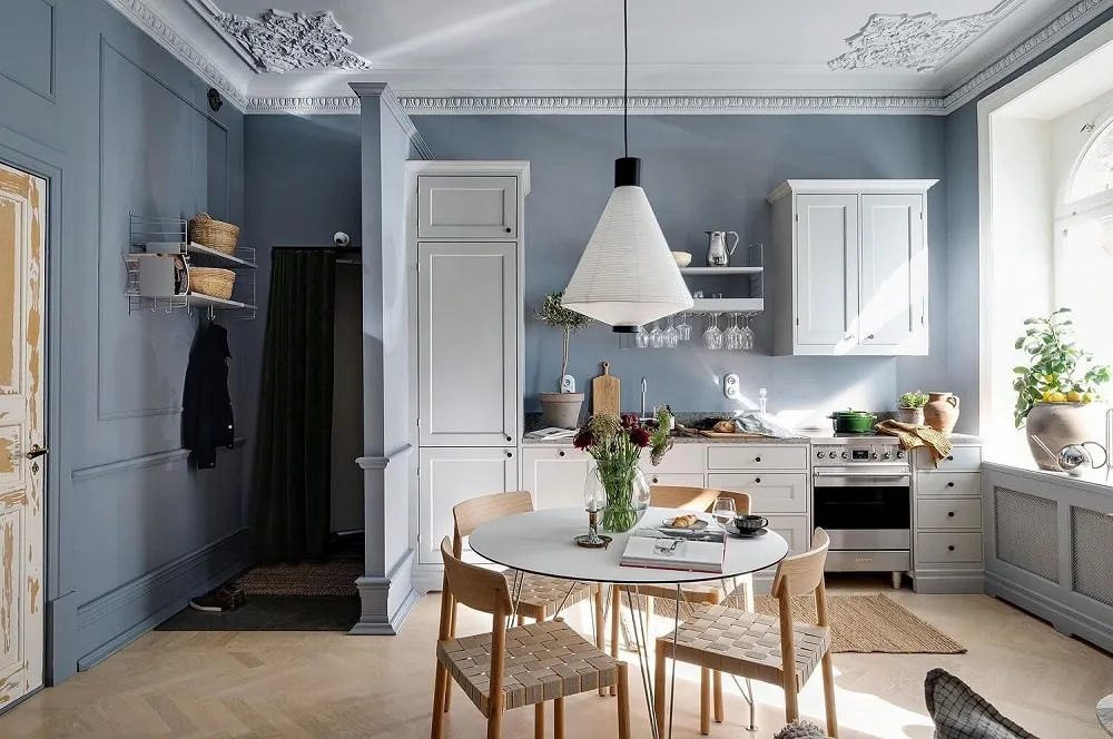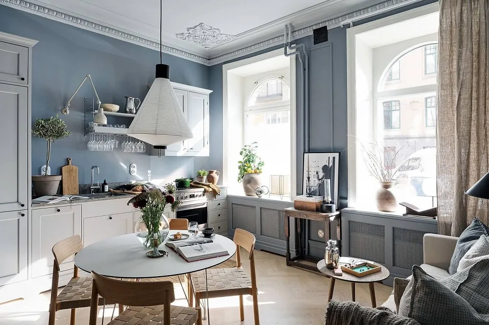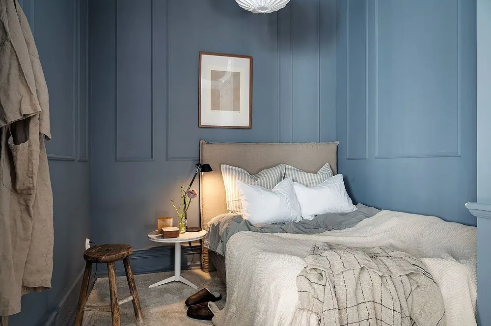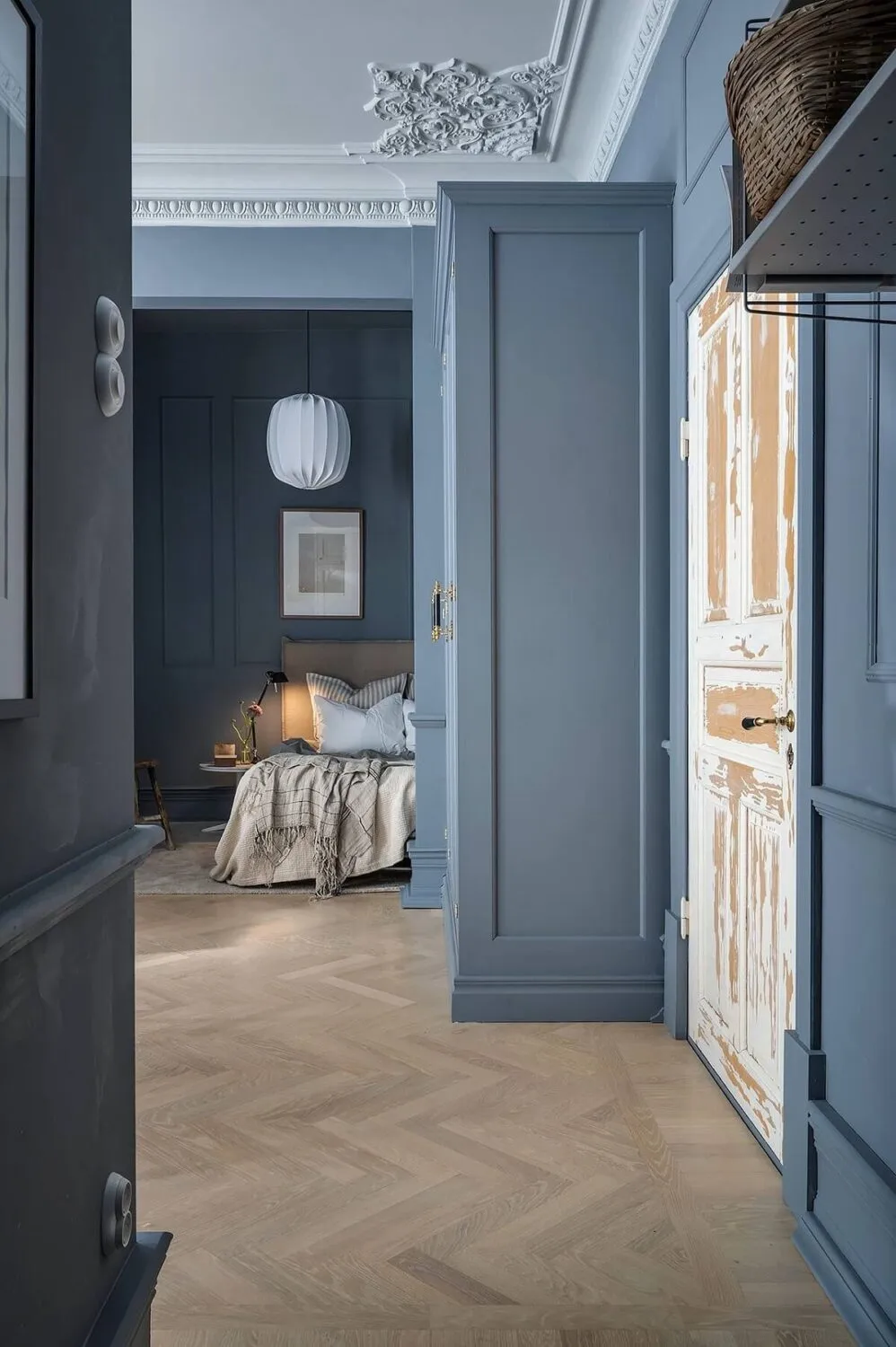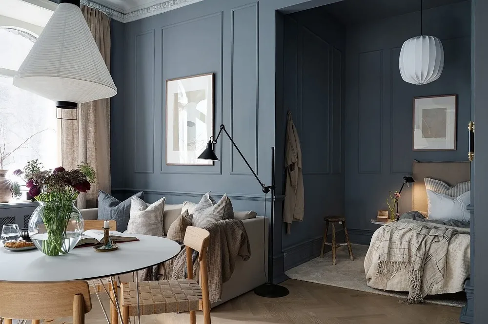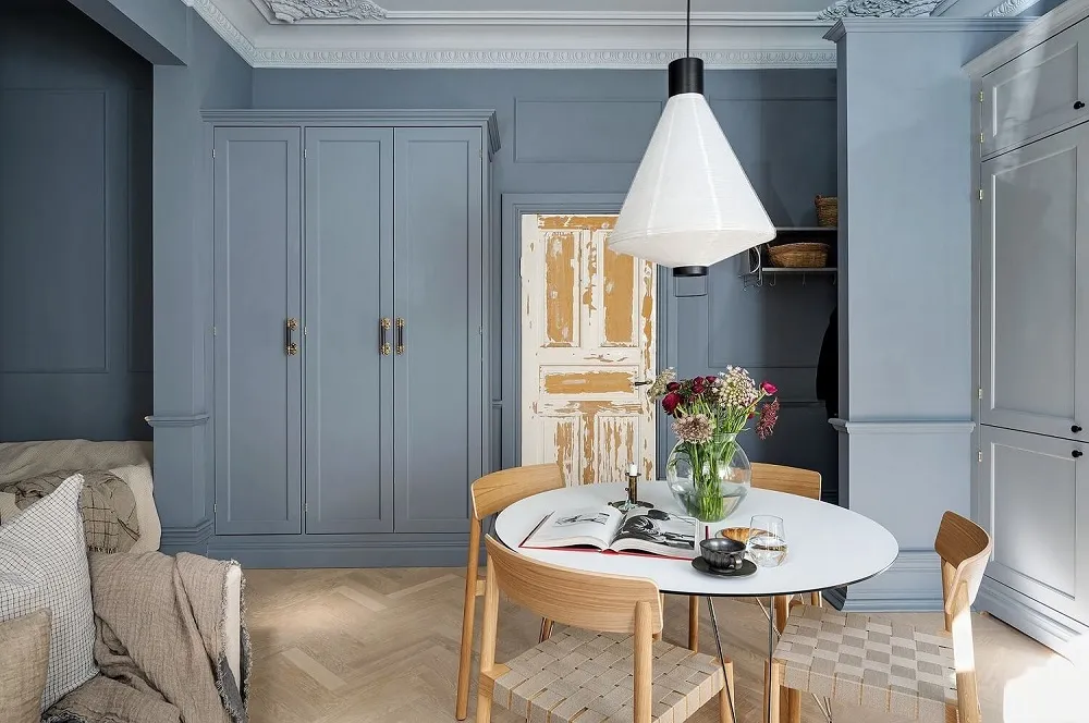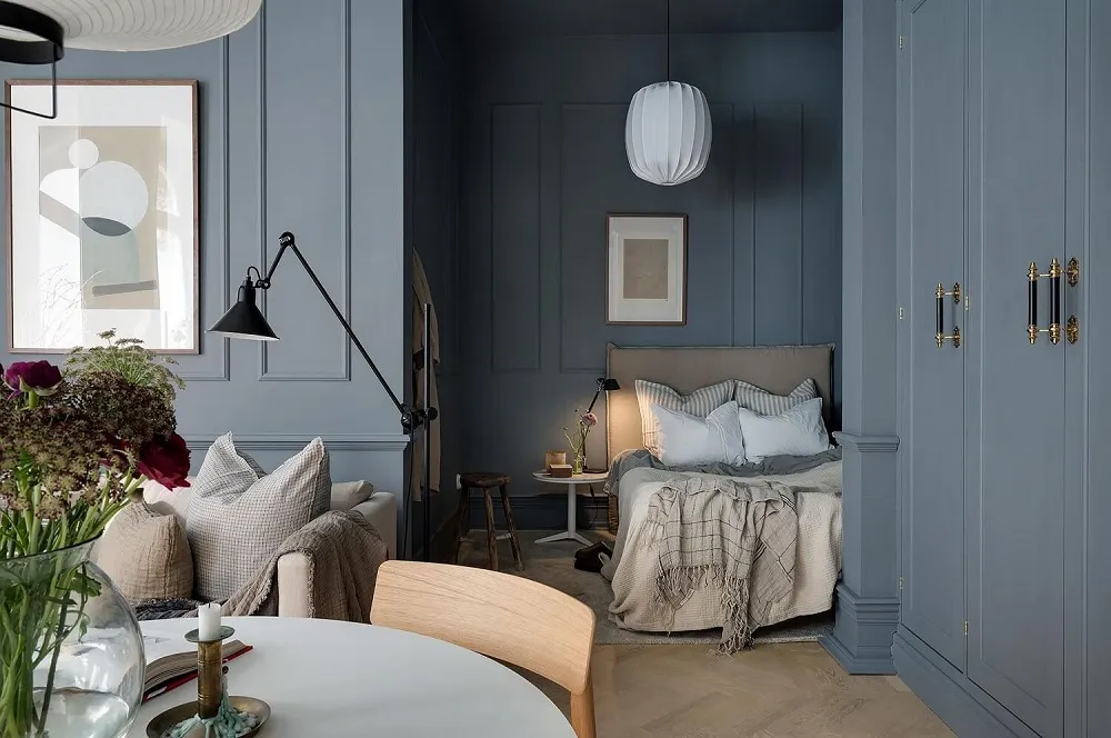 Niebieskie ściany, sypialnia w narożniku,Vintage drzwi: ciekawa studia w Szwecji (34 m²)