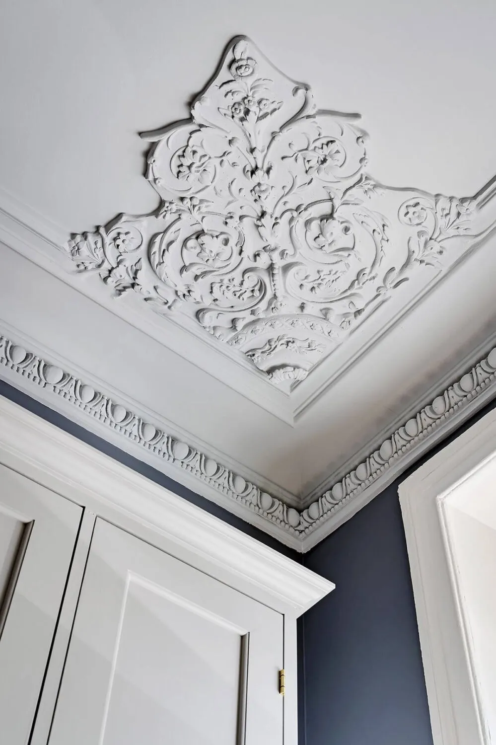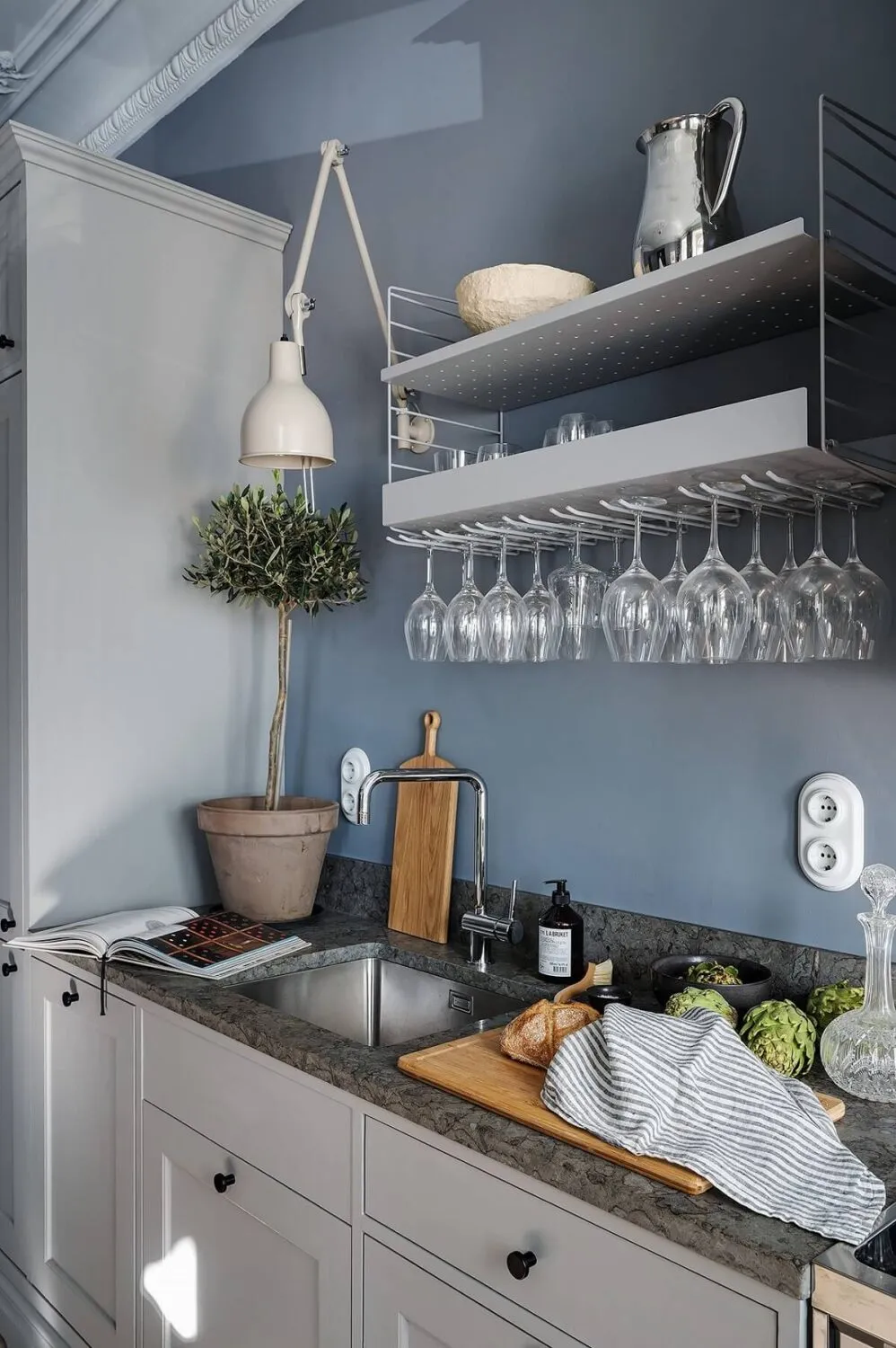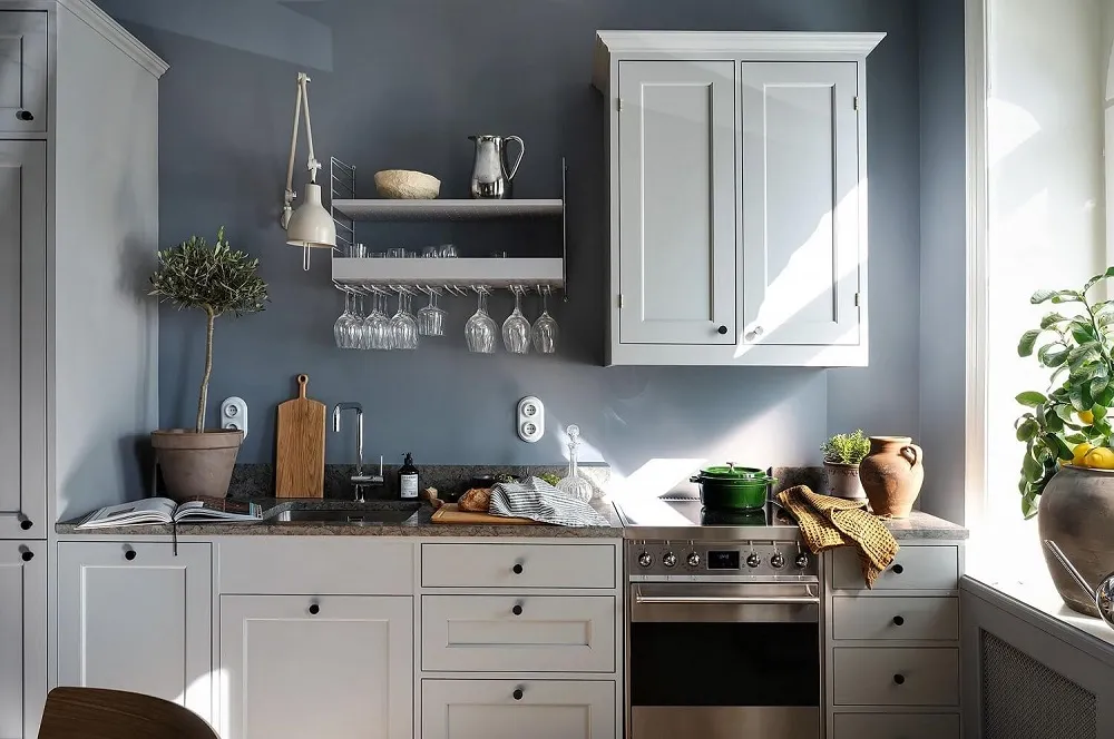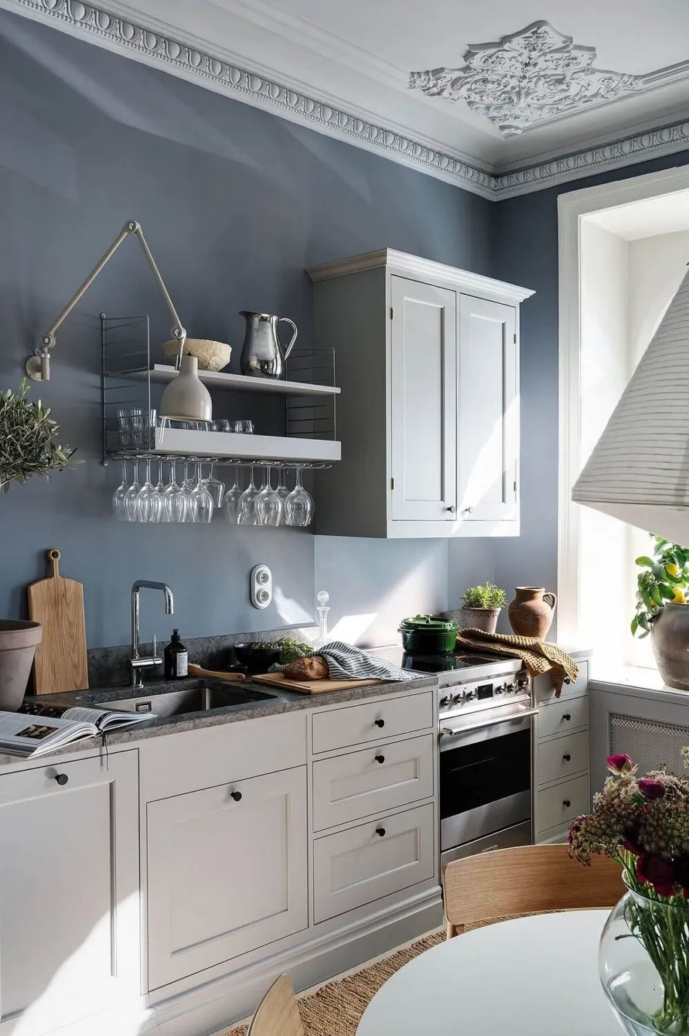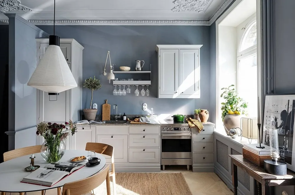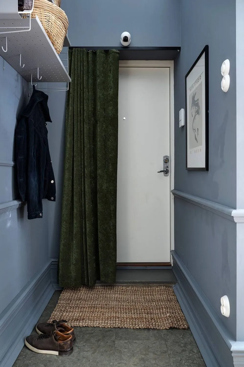 Niebieskie ściany, sypialnia w narożniku,Vintage drzwi: ciekawa studia w Szwecji (34 m²)