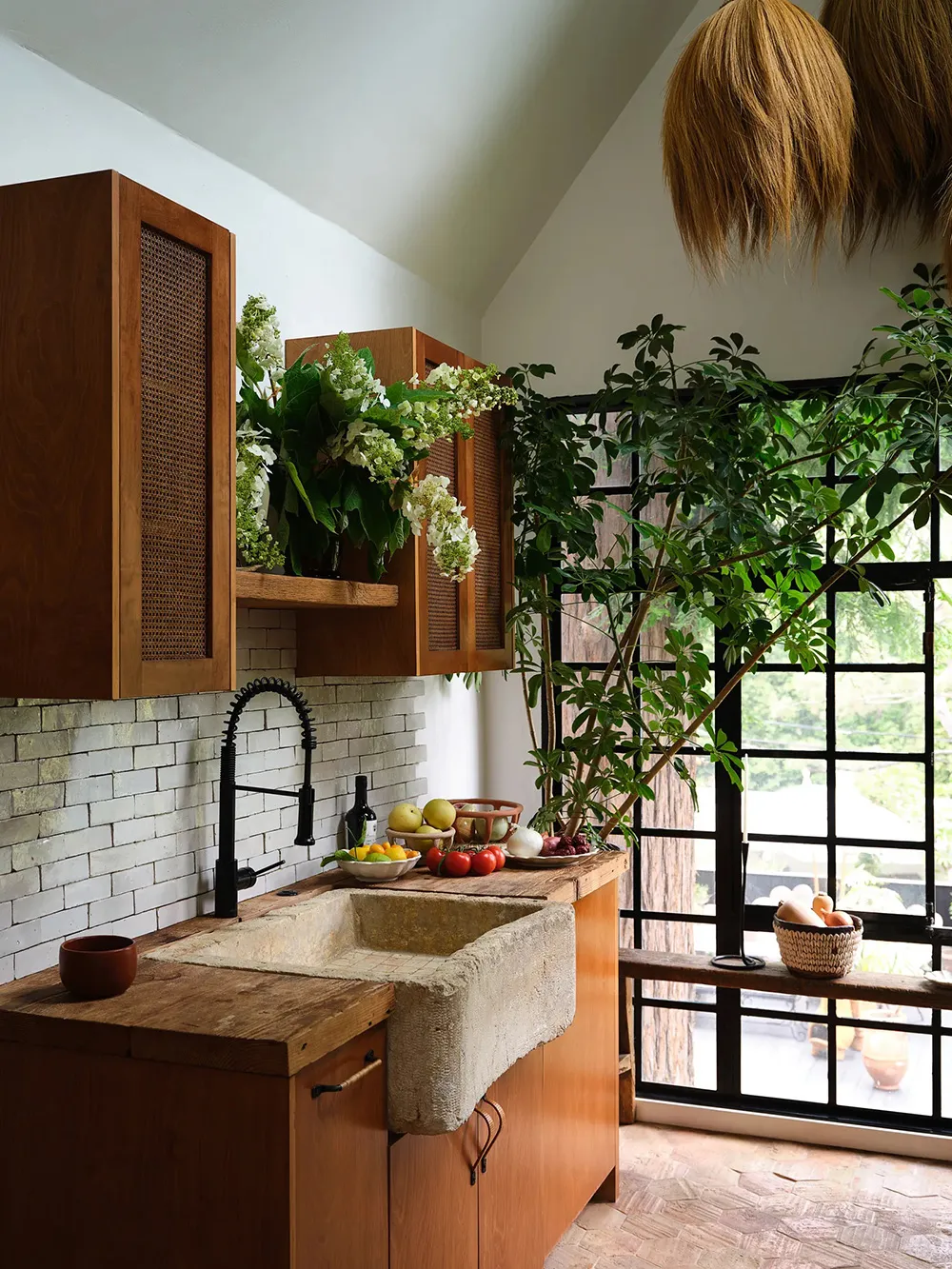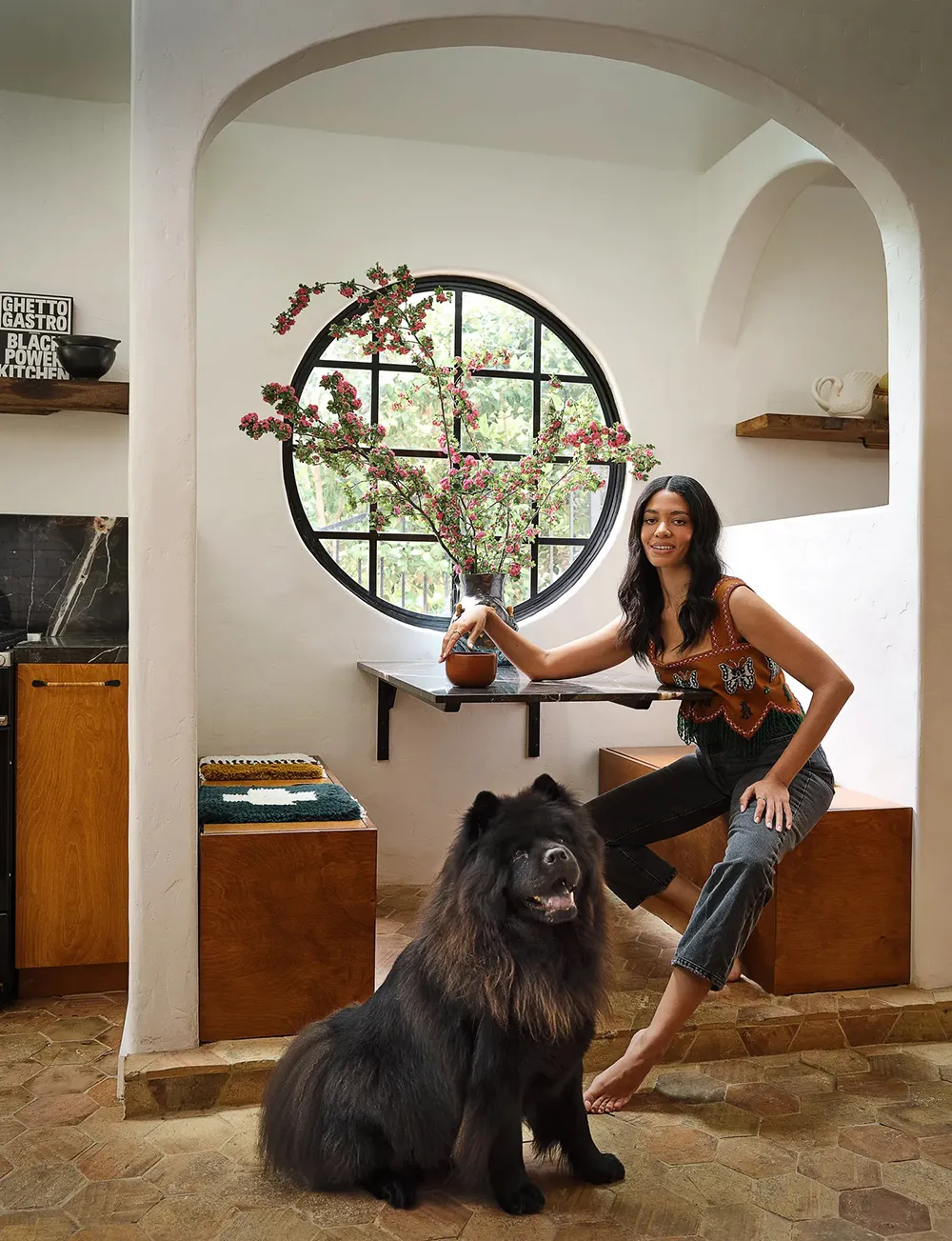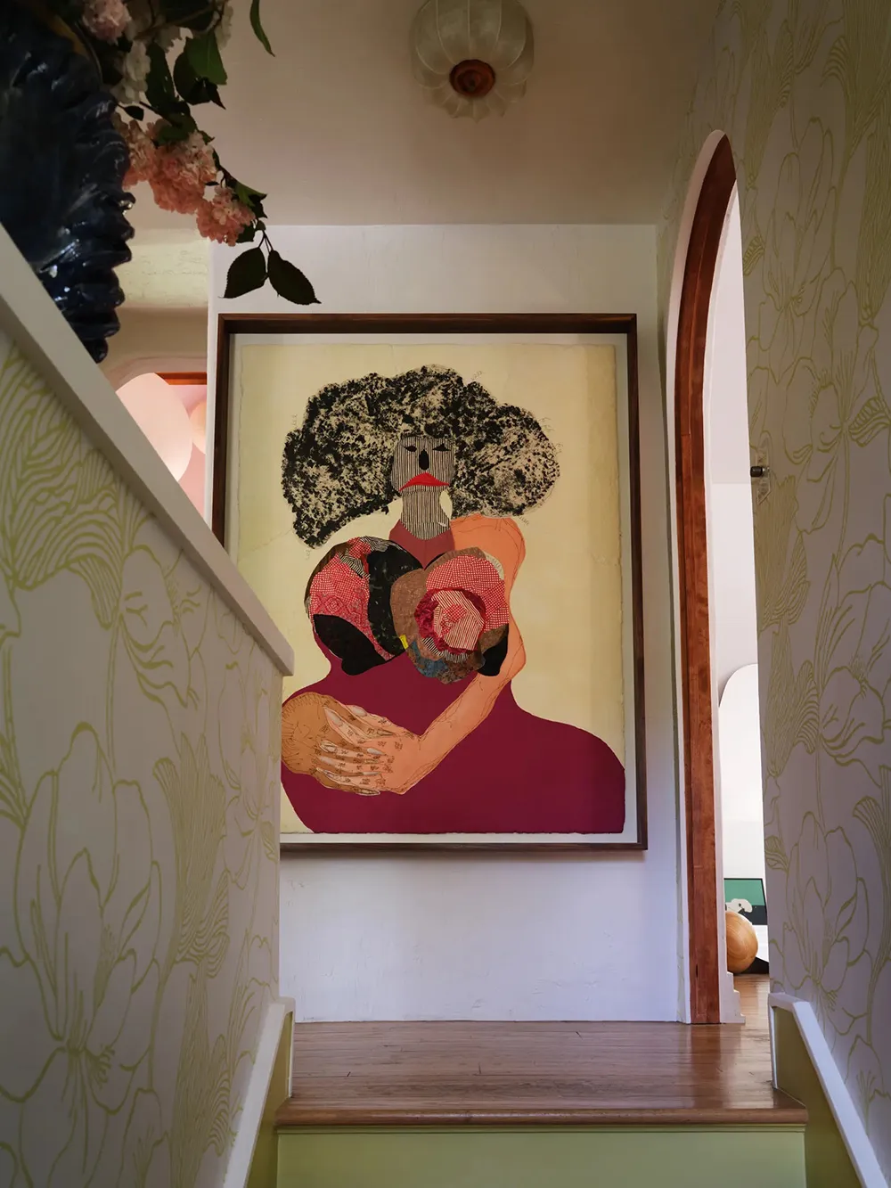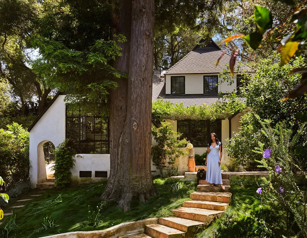 W przeciwieństwie do surowego, ale uroczość tradycyjnego czarno-białego fachu tego domu w Los Angeles, jego wnętrza przedstawiają bujne rozkwitanie jasnych kolorów i wyraziste przedmioty dekoracyjne.