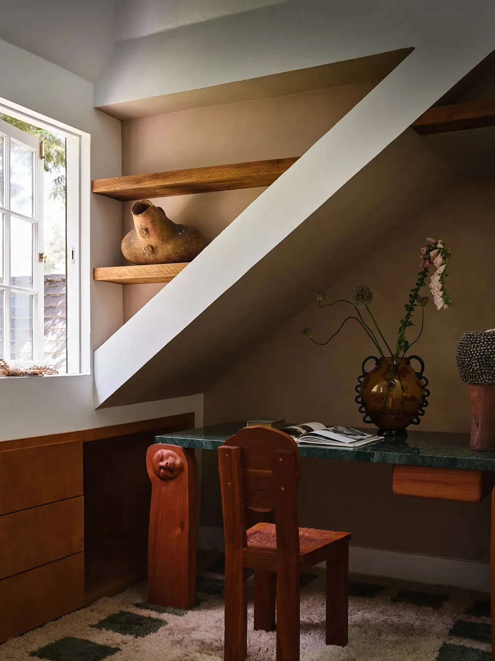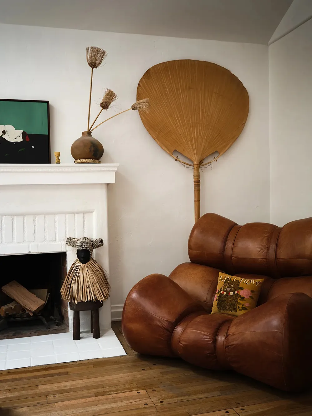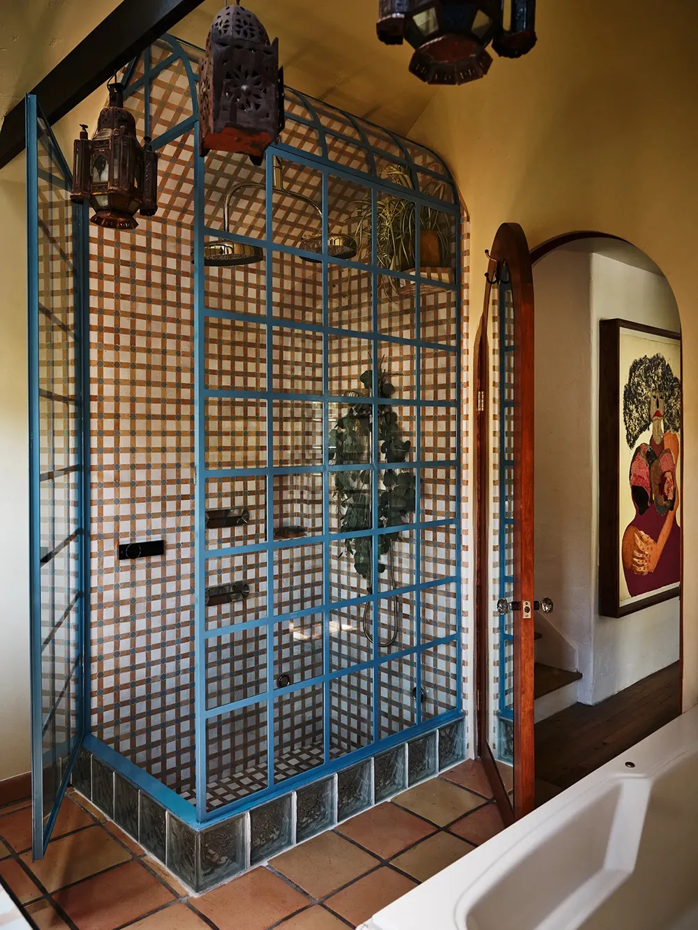 W przeciwieństwie do surowego, ale uroczość tradycyjnego czarno-białego fachu tego domu w Los Angeles, jego wnętrza przedstawiają bujne rozkwitanie jasnych kolorów i wyraziste przedmioty dekoracyjne.