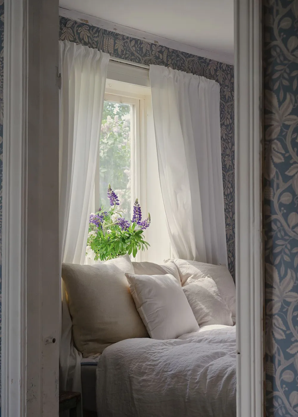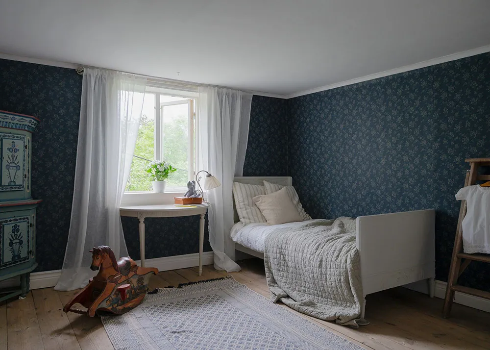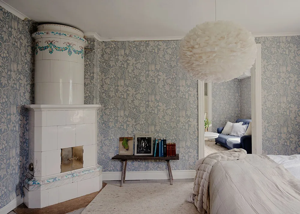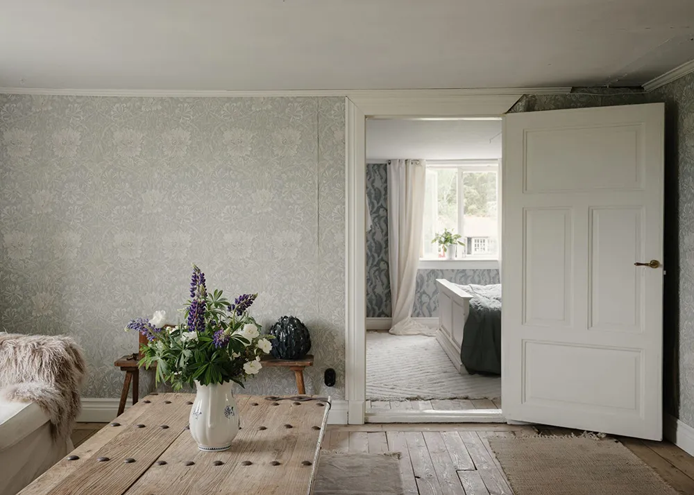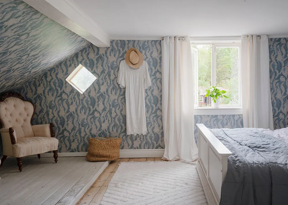 Tapety, tapety i jeszcze raz tapety — prawie wszystkie pokoje tego uroczego szwedzkiego domu dachowego ozdabiane są kwiatowymi wzorami.