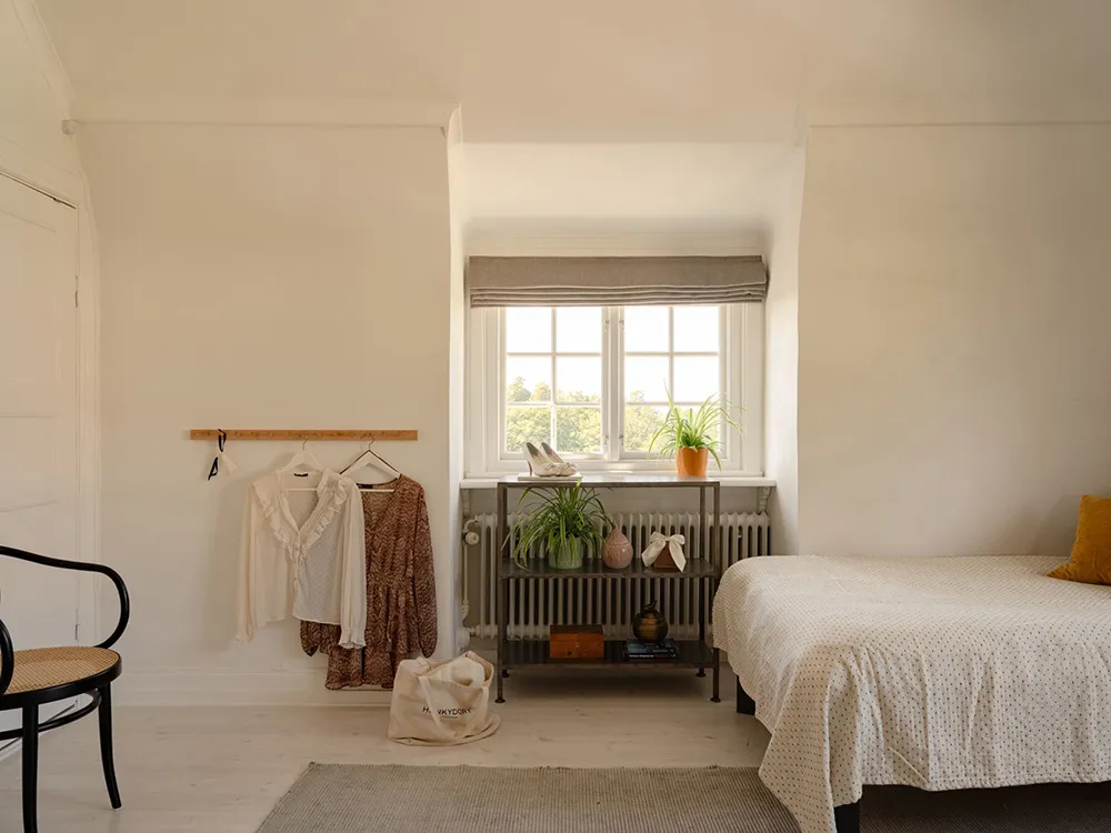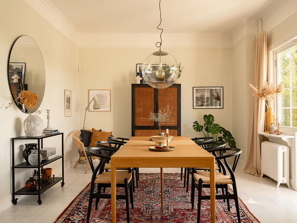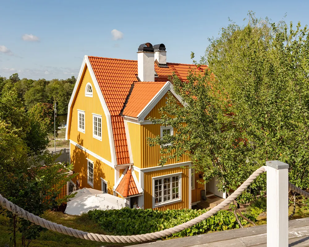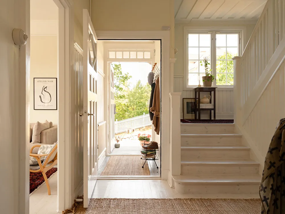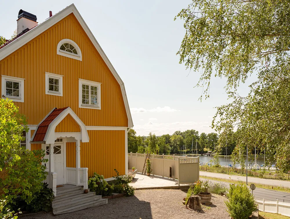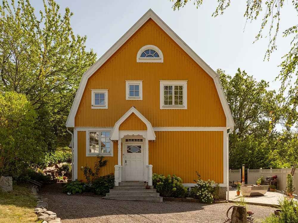 Słoneczna żółta willa w Szwecji z jasnymi wnętriami