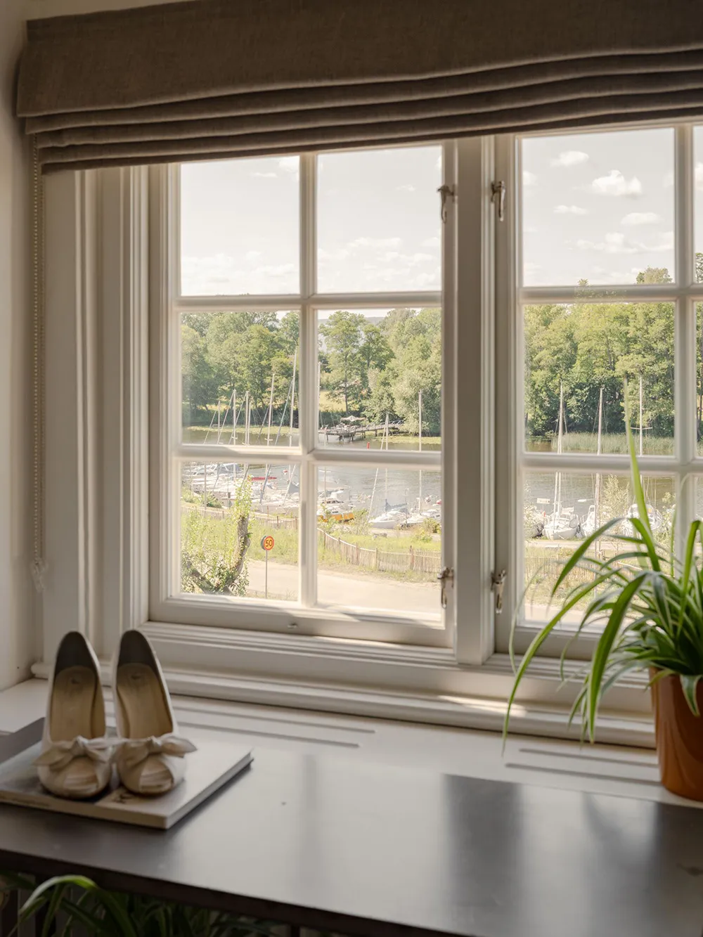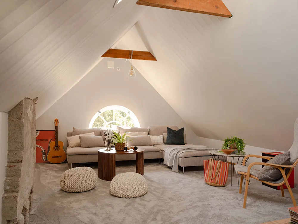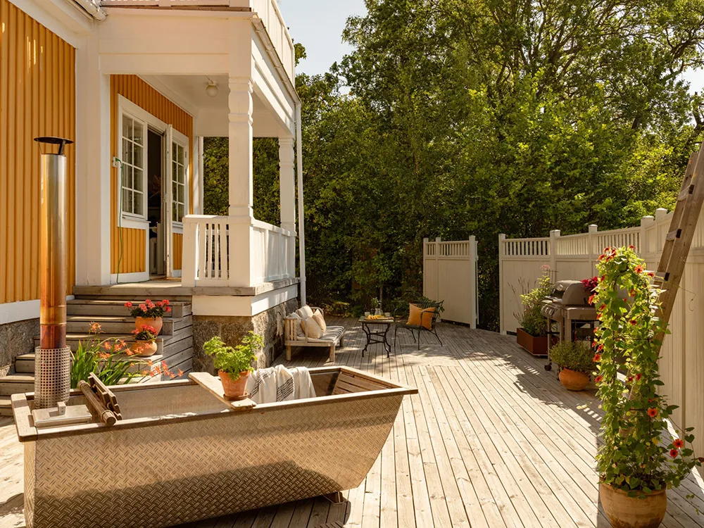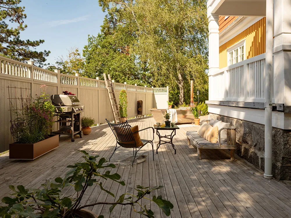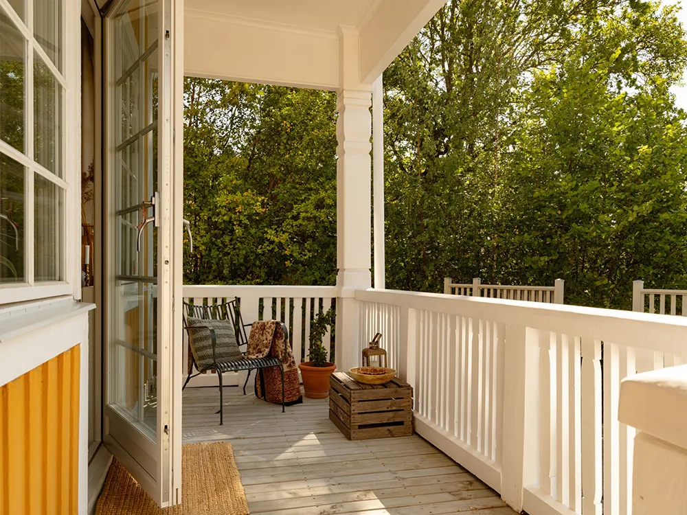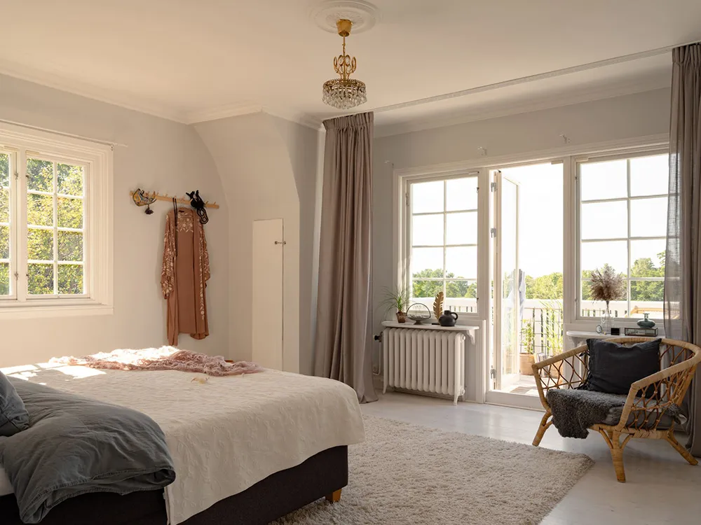 Słoneczna żółta willa w Szwecji z jasnymi wnętriami
