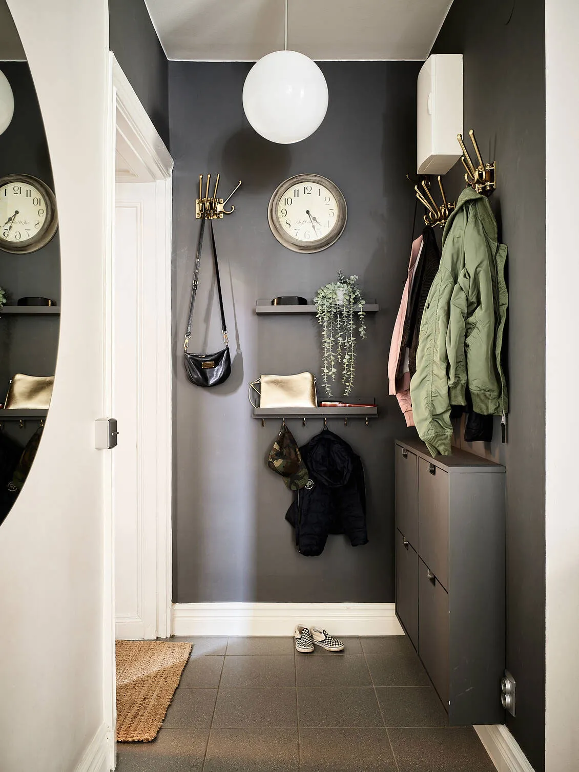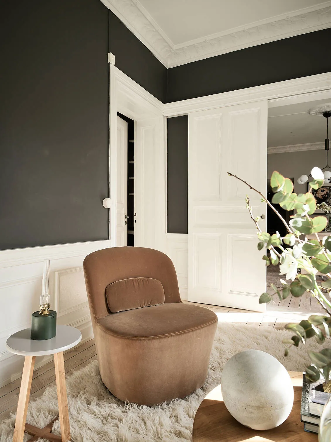W wnętrzach tego szwedzkiego mieszkania jest tak dużo naturalnego światła, że nawet ciemne ściany nie sprawiają wrażenia przyczucia czy smutnego wnętrza.