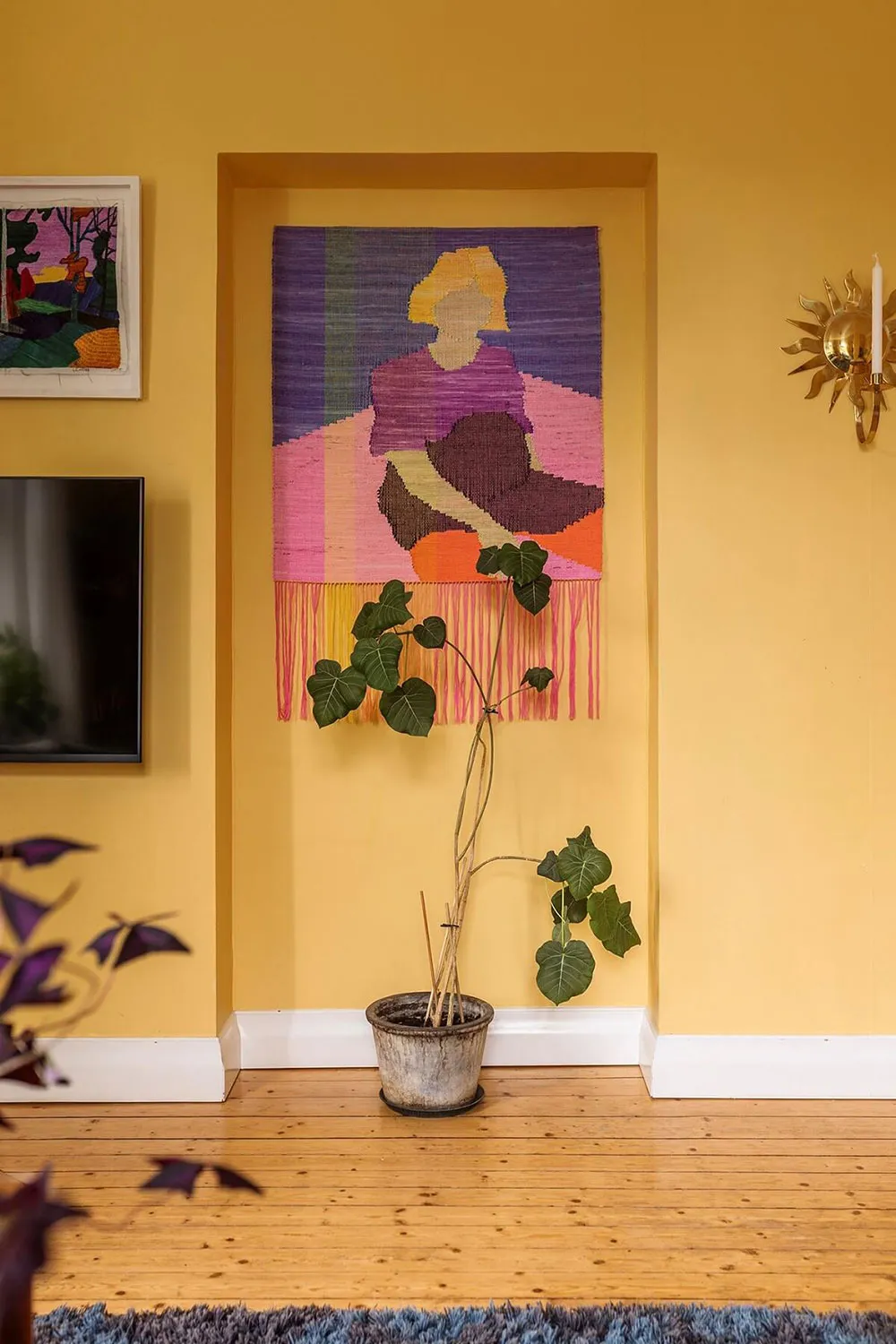W salonie tego szwedzkiego mieszkania panuje atmosfera wiecznego lata — jasnożółte ściany, kolorowe plakaty i żywe rośliny tworzą nastrój tego wnętrza.