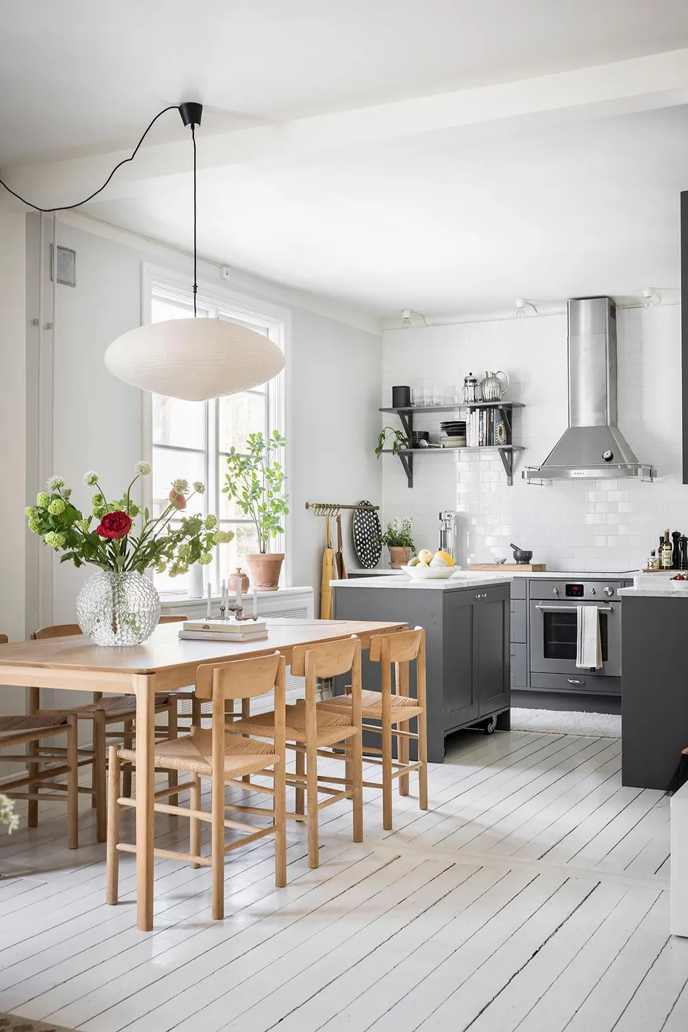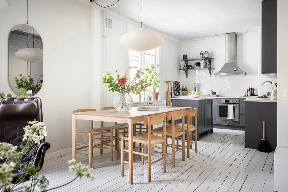 W tej szwedzkiej kwaterze bardzo podobało się przestrzeń salonu-kuchni.