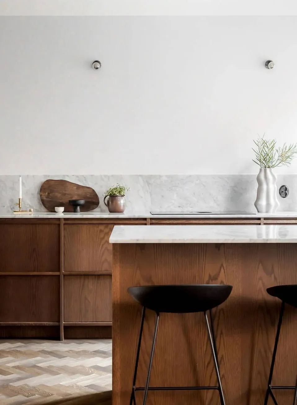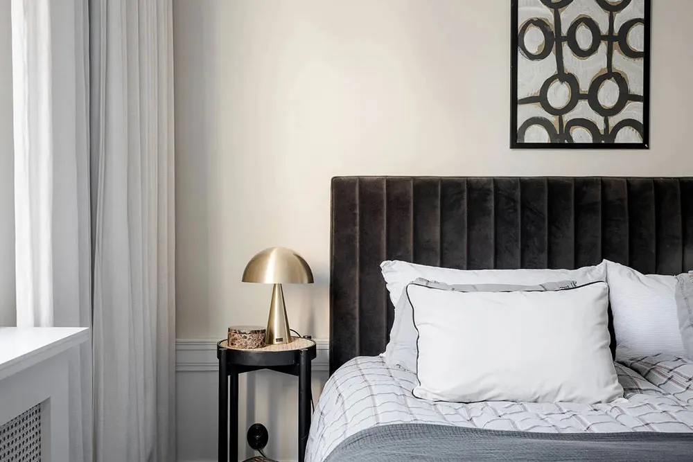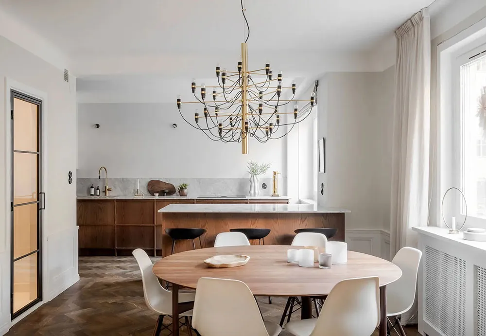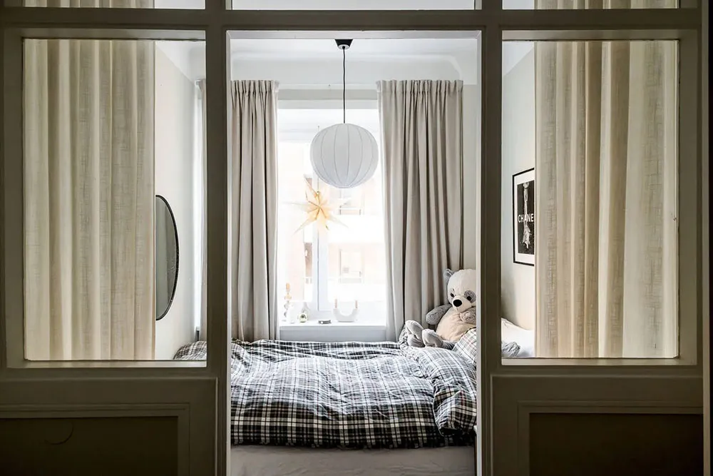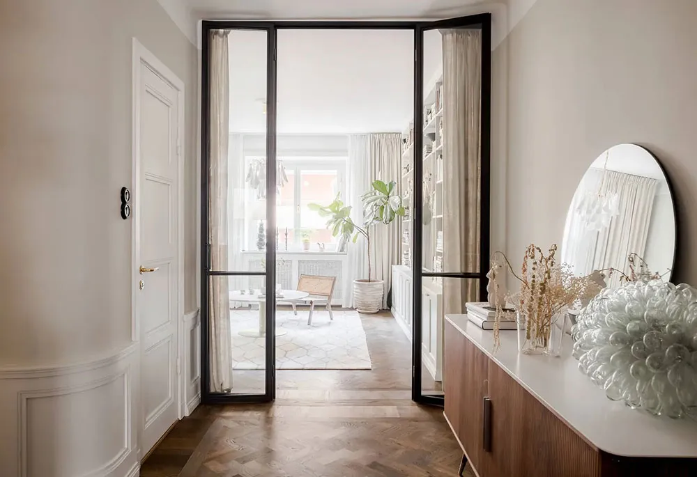 W tym skandynawskim wnętrzu prawie nie ma klasycznych elementów dekoracyjnych — tylko ściany panelowe, a nawet one są ścisłe i zrestrahowane.