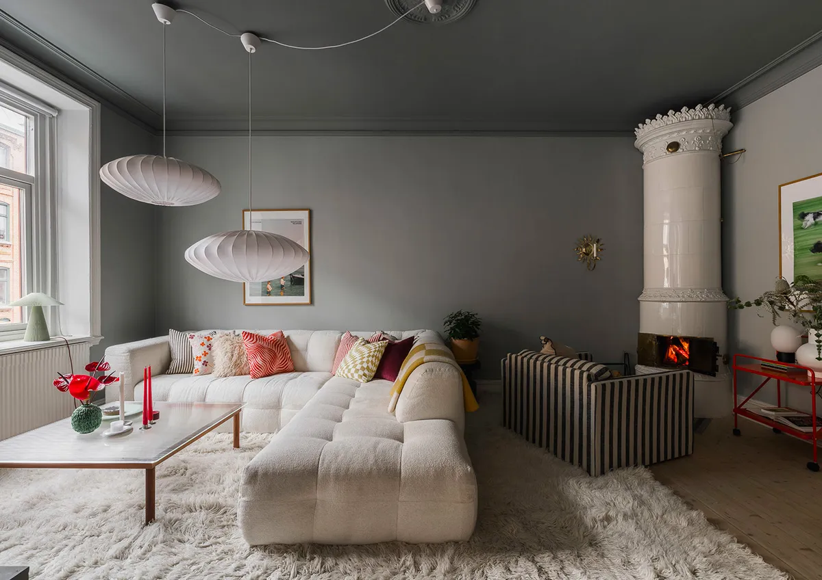 Efektowna szara salona i różowa kuchnia: mieszkanie w Gotenborgu (72 m²)
