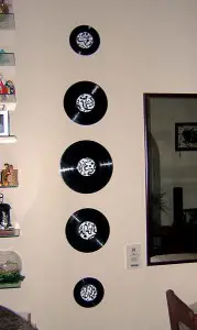 В каждом доме найдется несколько виниловых пластинок. Скажите, вы когда-нибудь будете их слушать? У вас даже патефон остался? Наверняка, нет. Ну что ж, тогда немножечко времени для их преобразования. Нагрейте ножницы, подключите воображение и за работу. Вы можете вырезать какую-нибудь фигурку или сюжет, а можете просто сделать разные диаметры и заклеить серединку. Вуаля, у вас в комнате появилась прекрасно декорированная стена.