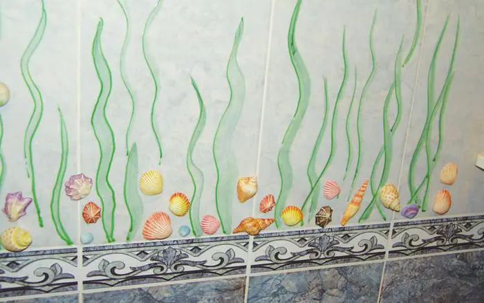 Каждое лето мы едим на море и что мы оттуда везем? Правильно, ракушки. Не стоит их беречь и складировать, настало время найти им рациональное применение. Берем наш хрупкий материал, покрываем лаком и высушиваем. Вооружаемся клеем, теперь уже прочными ракушками и двигаемся в ванную. Несколько часов таврчества…