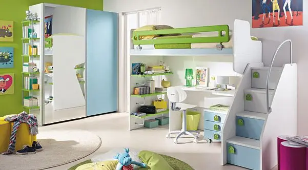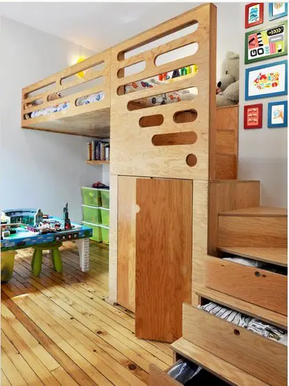 Большим плюсом в такой мебели является использование практически всего свободного пространства. Лестница на «второй этаж» может служить в качестве ящиков для игрушек либо вещей. «Ножки» второго яруса также могут служить полочками или этажерками для книг или каких-либо приятных мелочей.