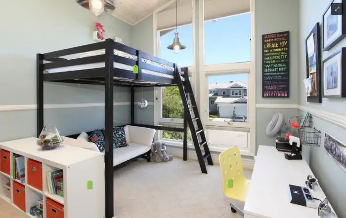 Если ваш ребенок ученик школы, то под верхним ярусом кровати очень удобно расположить рабочее место со всем необходимым: книгами, полками, компьютером и рабочим столом.