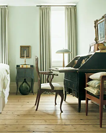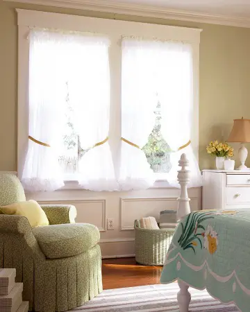 Очень мило смотрится использование в интерьере «женских» деталей – оборок, кружев, лент, вышитых подушечек и скатертей, пледов. В сочетании с нежным зеленым оттенком комнаты эти детали придадут уют и обаяние.