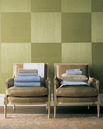 Самый легкий путь изменить цвета в спальне – добавить цвет. Если вы устали от своих однотонных обоев, наклейте квадраты из той же цветовой гаммы на стену в шахматном порядке. В сочетании с низкими массивными стульями и контрастными мягкими подушечками вы получите неповторимый современный интерьер.